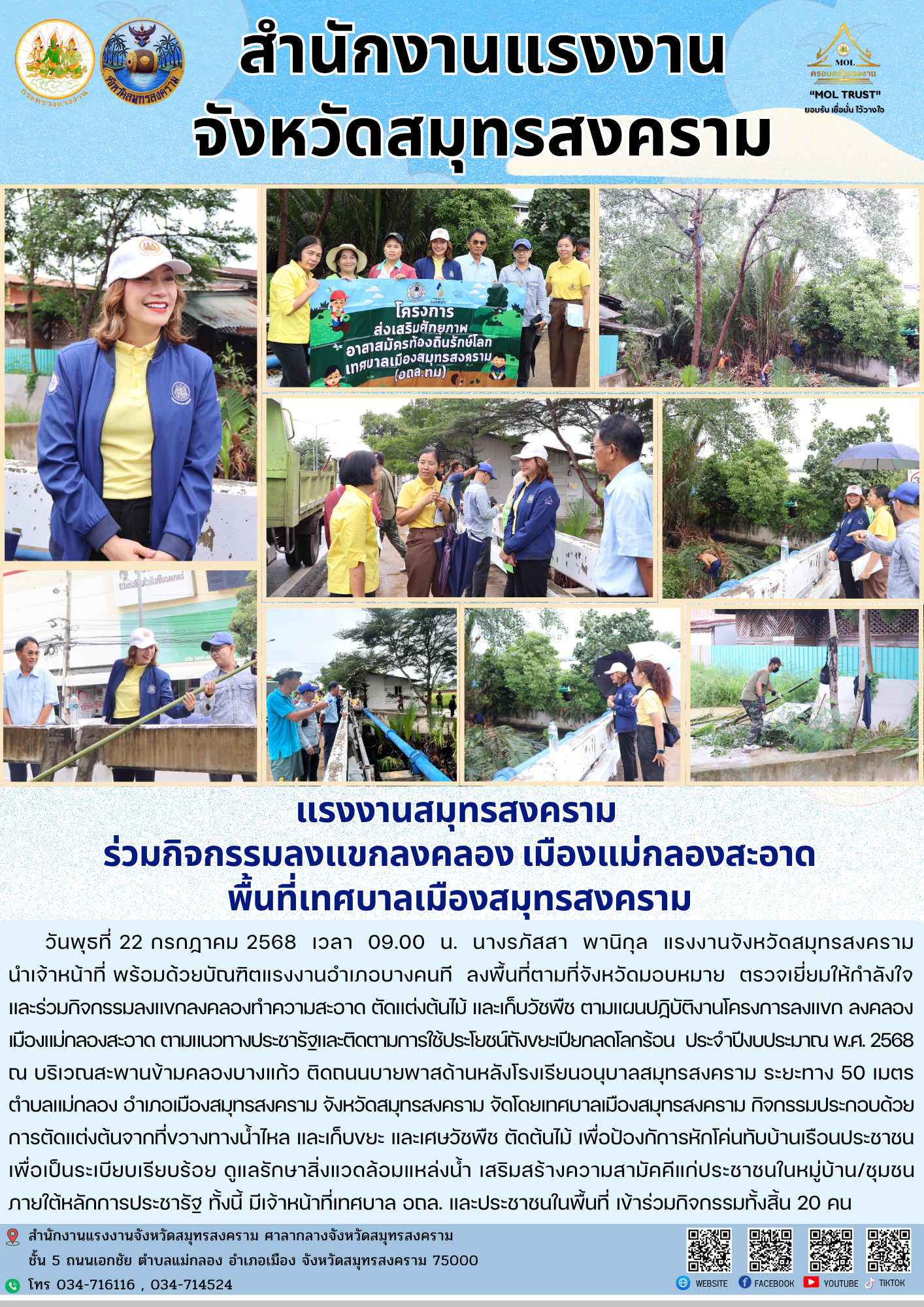 วันพุธที่ 22 กรกฏาคม 2568 เวลา 09.00 น. นางรภัสสา พานิกุล แรงงานจังหวัดสมุทรสงคราม นำเจ้าหน้าที่ พร้อมด้วยบัณฑิตแรงงานอำเภอบางคนที ลงพื้นที่ตามที่จังหวัดมอบหมาย ตรวจเยี่ยมให้กำลังใจและร่วมกิจกรรมลงแขกลงคลองทำความสะอาด ตัดแต่งต้นไม้ และเก็บวัชพืช ตามแผนปฏิบัติงานโครงการลงแขก ลงคลอง เมืองแม่กลองสะอาด ตามแนวทางประชารัฐและติดตามการใช้ประโยชน์ถังขยะเปียกลดโลกร้อน ประจำปีงบประมาณ พ.ศ. 2568 ณ บริเวณสะพานข้ามคลองบางแก้ว ติดถนนบายพาสด้านหลังโรงเรียนอนุบาลสมุทรสงคราม ระยะทาง 50 เมตร ตำบลแม่กลอง อำเภอเมืองสมุทรสงคราม จังหวัดสมุทรสงคราม จัดโดยเทศบาลเมืองสมุทรสงคราม กิจกรรมประกอบด้วยการตัดแต่งต้นจากที่ขวางทางน้ำไหล และเก็บขยะ และเศษวัชพืช ตัดต้นไม้ เพื่อป้องกัการหักโค่นทับบ้านเรือนประชาชนเพื่อเป็นระเบียบเรียบร้อย ดูแลรักษาสิ่งแวดล้อมแหล่งน้ำ เสริมสร้างความสามัคคีแก่ประชาชนในหมู่บ้าน/ชุมชน ภายใต้หลักการประชารัฐ ทั้งนี้ มีเจ้าหน้าที่เทศบาล อถล. และประชาชนในพื้นที่ เข้าร่วมกิจกรรมทั้งสิ้น 20 คน