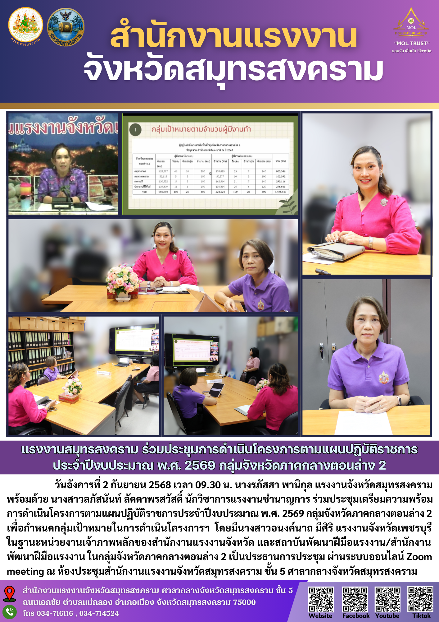 วันอังคารที่ 2 กันยายน 2568 เวลา 09.30 น. นางรภัสสา พานิกุล แรงงานจังหวัดสมุทรสงครามพร้อมด้วย นางสาวลภัสนันท์ ลัดดาพรสวัสดิ์ นักวิชาการแรงงานชำนาญการ ร่วมประชุมเตรียมความพร้อมการดำเนินโครงการตามแผนปฏิบัติราชการประจำปีงบประมาณ พ.ศ. 2569 กลุ่มจังหวัดภาคกลางตอนล่าง 2 เพื่อกำหนดกลุ่มเป้าหมายในการดำเนินโครงการฯ โดยมีนางสาวอนงค์นาถ มีศิริ แรงงานจังหวัดเพชรบุรี ในฐานะหน่วยงานเจ้าภาพหลักของสำนักงานแรงงานจังหวัด และสถาบันพัฒนาฝีมือแรงงาน/สำนักงานพัฒนาฝีมือแรงงาน ในกลุ่มจังหวัดภาคกลางตอนล่าง 2 เป็นประธานการประชุม ผ่านระบบออนไลน์ Zoom meeting ณ ห้องประชุมสำนักงานแรงงานจังหวัดสมุทรสงคราม ชั้น 5 ศาลากลางจังหวัดสมุทรสงคราม