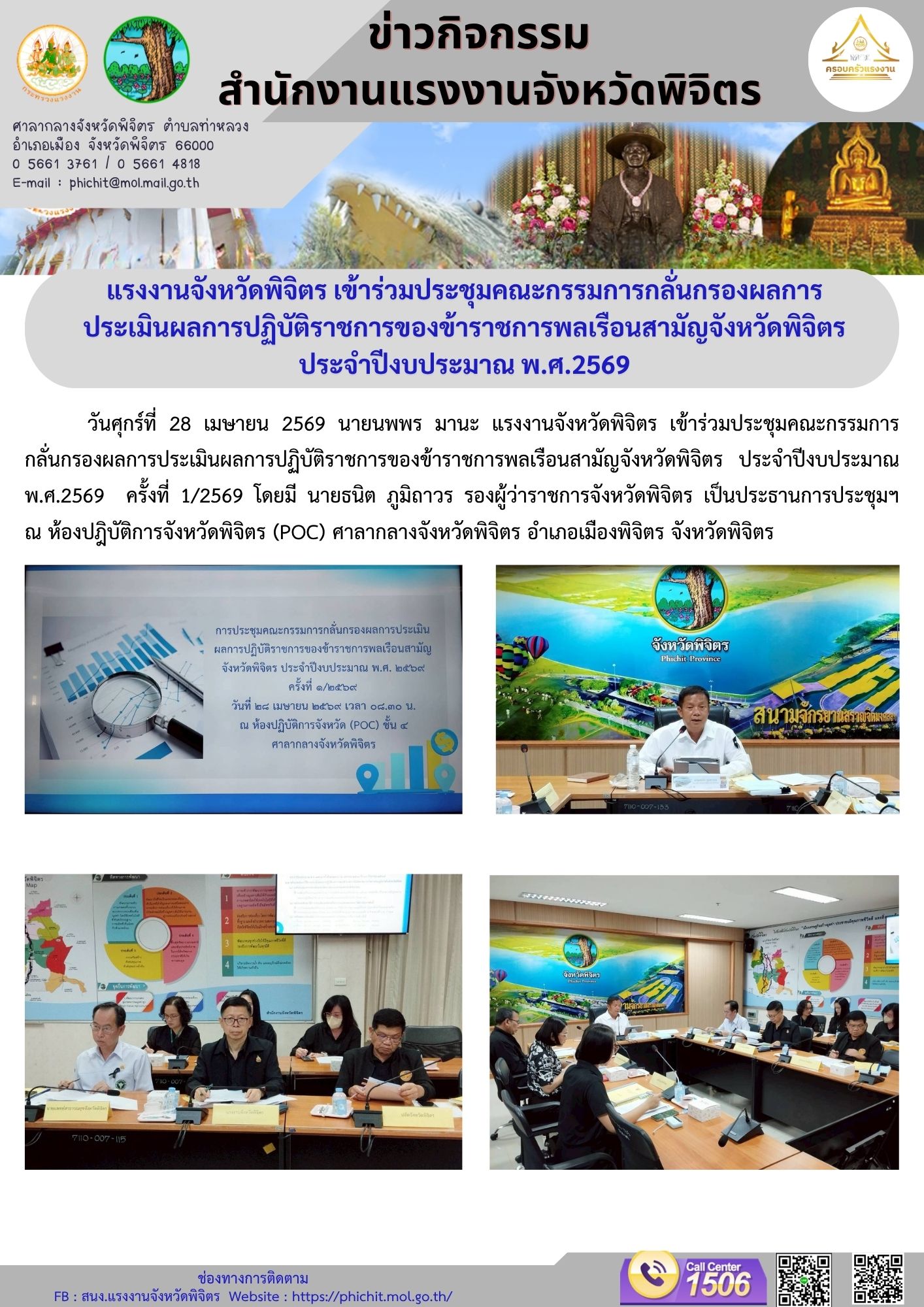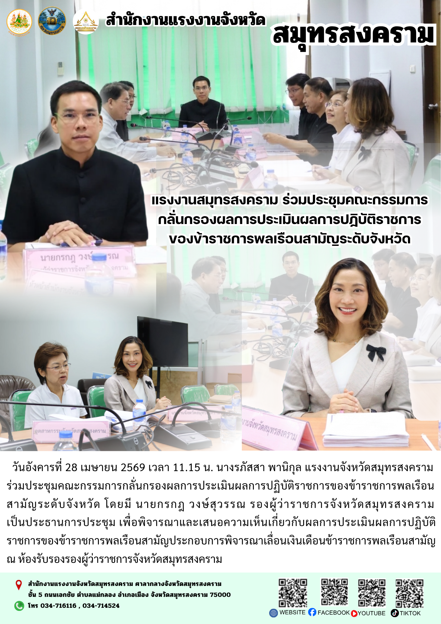 วันอังคารที่ 28 เมษายน 2569 เวลา 11.15 น. นางรภัสสา พานิกุล แรงงานจังหวัดสมุทรสงคราม ร่วมประชุมคณะกรรมการกลั่นกรองผลการประเมินผลการปฏิบัติราชการของข้าราชการพลเรือนสามัญระดับจังหวัด โดยมี นายกรกฎ วงษ์สุวรรณ รองผู้ว่าราชการจังหวัดสมุทรสงคราม เป็นประธานการประชุม เพื่อพิจารณาและเสนอความเห็นเกี่ยวกับผลการประเมินผลการปฏิบัติราชการของข้าราชการพลเรือนสามัญประกอบการพิจารณาเลื่อนเงินเดือนข้าราชการพลเรือนสามัญ ณ ห้องรับรองรองผู้ว่าราชการจังหวัดสมุทรสงคราม