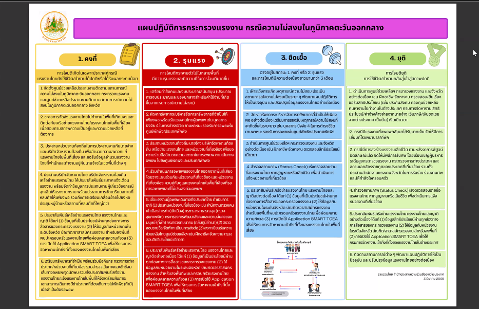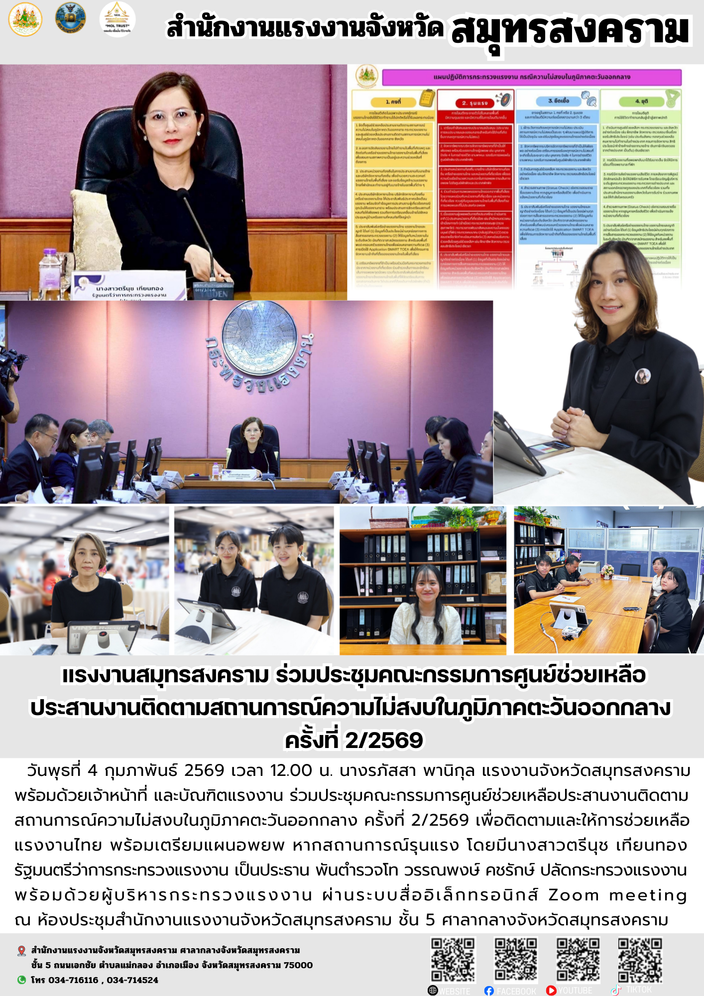 วันพุธที่ 4 กุมภาพันธ์ 2569 เวลา 12.00 น. นางรภัสสา พานิกุล แรงงานจังหวัดสมุทรสงคราม พร้อมด้วยเจ้าหน้าที่ และบัณฑิตแรงงาน ร่วมประชุมคณะกรรมการศูนย์ช่วยเหลือประสานงานติดตามสถานการณ์ความไม่สงบในภูมิภาคตะวันออกกลาง ครั้งที่ 2/2569 เพื่อติดตามและให้การช่วยเหลือแรงงานไทย พร้อมเตรียมแผนอพยพ หากสถานการณ์รุนแรง โดยมีนางสาวตรีนุช เทียนทอง รัฐมนตรีว่าการกระทรวงแรงงาน เป็นประธาน พันตำรวจโท วรรณพงษ์ คชรักษ์ ปลัดกระทรวงแรงงาน พร้อมด้วยผู้บริหารกระทรวงแรงงาน ผ่านระบบสื่ออิเล็กทรอนิกส์ Zoom meeting ณ ห้องประชุมสำนักงานแรงงานจังหวัดสมุทรสงคราม ชั้น 5 ศาลากลางจังหวัดสมุทรสงคราม