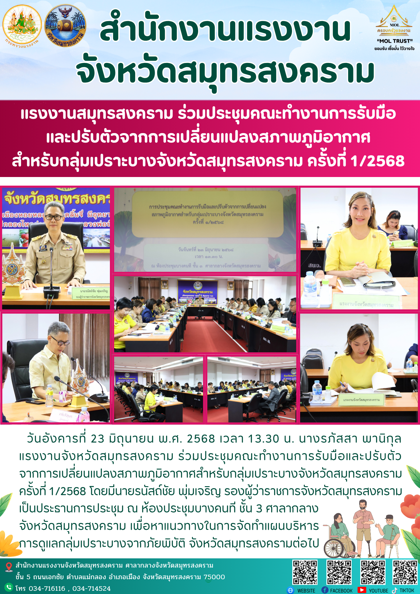 วันอังคารที่ 23 มิถุนายน พ.ศ. 2568 เวลา 13.30 น. นางรภัสสา พานิกุล แรงงานจังหวัดสมุทรสงคราม ร่วมประชุมคณะทำงานการรับมือและปรับตัว จากการเปลี่ยนแปลงสภาพภูมิอากาศสำหรับกลุ่มเปราะบางจังหวัดสมุทรสงคราม ครั้งที่ 1/2568 โดยมีนายรนัสถ์ชัย พุ่มเจริญ รองผู้ว่าราชการจังหวัดสมุทรสงคราม เป็นประธานการประชุม ณ ห้องประชุมบางคนที ชั้น 3 ศาลากลางจังหวัดสมุทรสงคราม เพื่อหาแนวทางในการจัดทำแผนบริหารการดูแลกลุ่มเปราะบางจากภัยพิบัติ จังหวัดสมุทรสงครามต่อไป