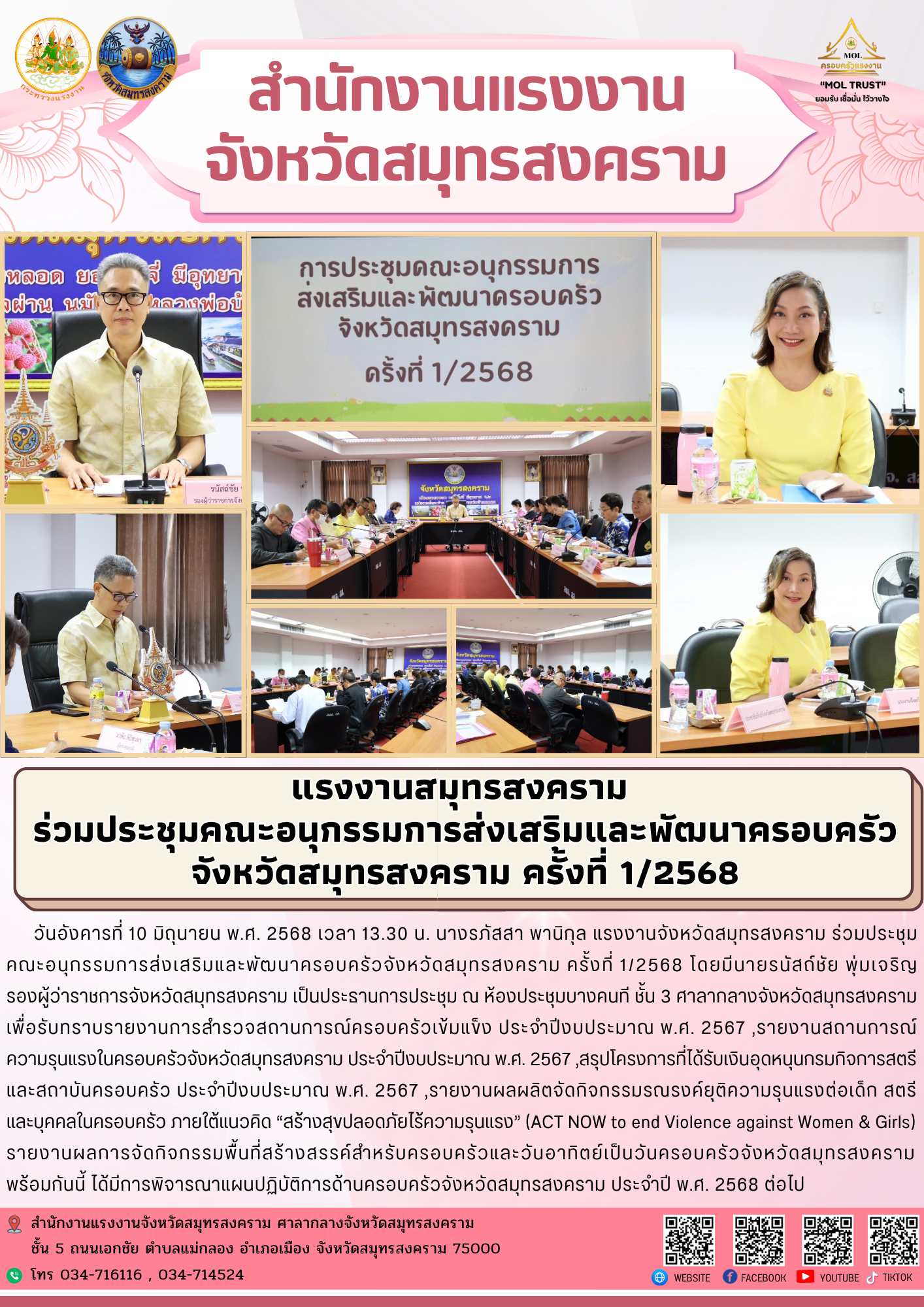 วันอังคารที่ 10 มิถุนายน พ.ศ. 2568 เวลา 13.30 น. นางรภัสสา พานิกุล แรงงานจังหวัดสมุทรสงคราม ร่วมประชุมคณะอนุกรรมการส่งเสริมและพัฒนาครอบครัวจังหวัดสมุทรสงคราม ครั้งที่ 1/2568 โดยมีนายรนัสถ์ชัย พุ่มเจริญ รองผู้ว่าราชการจังหวัดสมุทรสงคราม เป็นประธานการประชุม ณ ห้องประชุมบางคนที ชั้น 3 ศาลากลางจังหวัดสมุทรสงคราม เพื่อรับทราบรายงานการสำรวจสถานการณ์ครอบครัวเข้มแข็ง ประจำปีงบประมาณ พ.ศ. 2567 ,รายงานสถานการณ์ความรุนแรงในครอบครัวจังหวัดสมุทรสงคราม ประจำปีงบประมาณ พ.ศ. 2567 ,สรุปโครงการที่ได้รับเงินอุดหนุนกรมกิจการสตรีและสถาบันครอบครัว ประจำปีงบประมาณ พ.ศ. 2567 ,รายงานผลผลิตจัดกิจกรรมรณรงค์ยุติความรุนแรงต่อเด็ก สตรี และบุคคลในครอบครัว ภายใต้แนวคิด “สร้างสุขปลอดภัยไร้ความรุนแรง” (ACT NOW to end Violence against Women & Girls) รายงานผลการจัดกิจกรรมพื้นที่สร้างสรรค์สำหรับครอบครัวและวันอาทิตย์เป็นวันครอบครัวจังหวัดสมุทรสงคราม พร้อมกันนี้ ได้มีการพิจารณาแผนปฏิบัติการด้านครอบครัวจังหวัดสมุทรสงคราม ประจำปี พ.ศ. 2568 ต่อไป