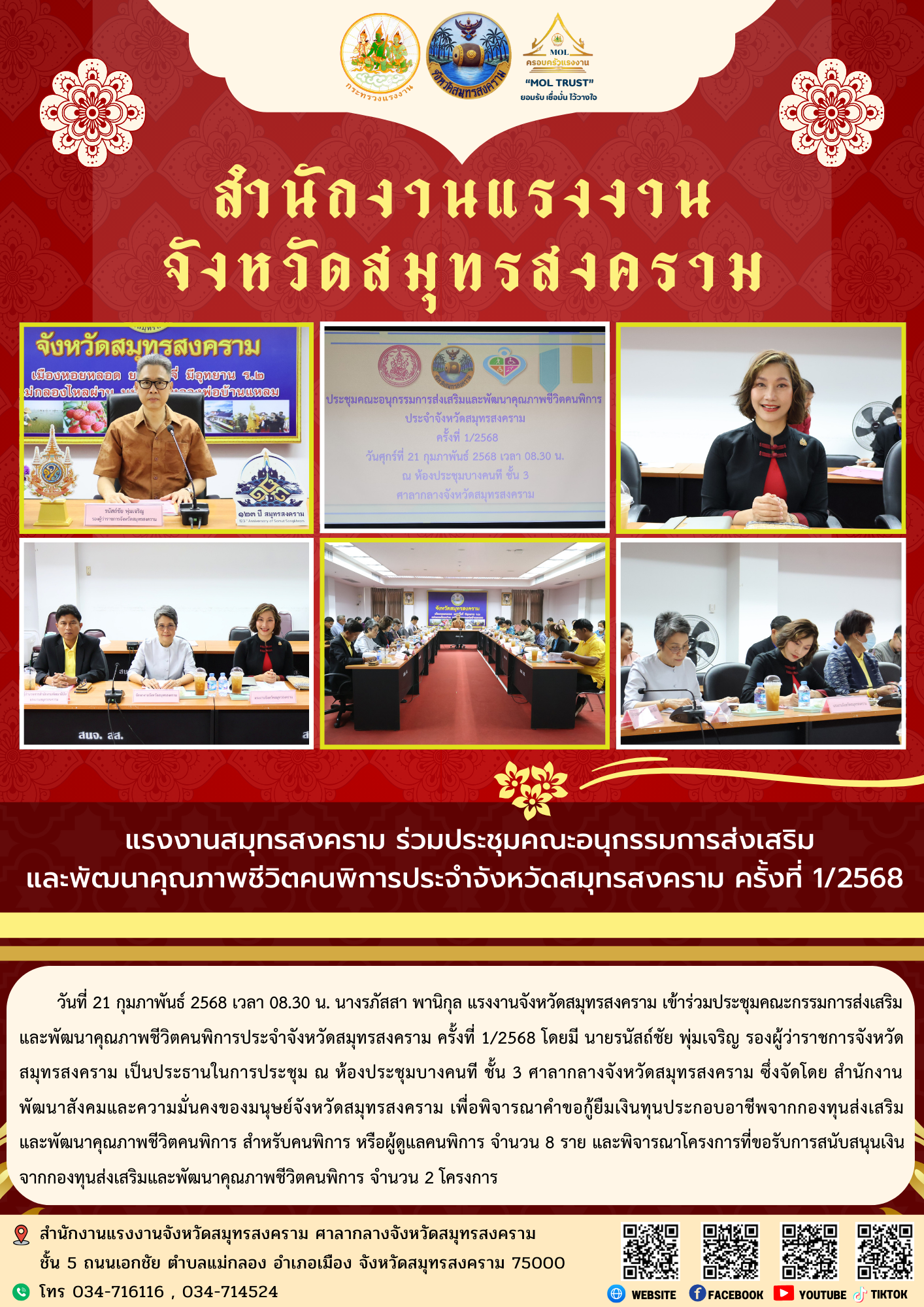 วันที่ 21 กุมภาพันธ์ 2568 เวลา 08.30 น. นางรภัสสา พานิกุล แรงงานจังหวัดสมุทรสงคราม เข้าร่วมประชุมคณะกรรมการส่งเสริมและพัฒนาคุณภาพชีวิตคนพิการประจำจังหวัดสมุทรสงคราม ครั้งที่ 1/2568 โดยมี นายรนัสถ์ชัย พุ่มเจริญ รองผู้ว่าราชการจังหวัดสมุทรสงคราม เป็นประธานในการประชุม ณ ห้องประชุมบางคนที ชั้น 3 ศาลากลางจังหวัดสมุทรสงคราม ซึ่งจัดโดย สำนักงานพัฒนาสังคมและความมั่นคงของมนุษย์จังหวัดสมุทรสงคราม เพื่อพิจารณาคำขอกู้ยืมเงินทุนประกอบอาชีพจากกองทุนส่งเสริมและพัฒนาคุณภาพชีวิตคนพิการ สำหรับคนพิการ หรือผู้ดูแลคนพิการ จำนวน 8 ราย และพิจารณาโครงการที่ขอรับการสนับสนุนเงินจากกองทุนส่งเสริมและพัฒนาคุณภาพชีวิตคนพิการ จำนวน 2 โครงการ