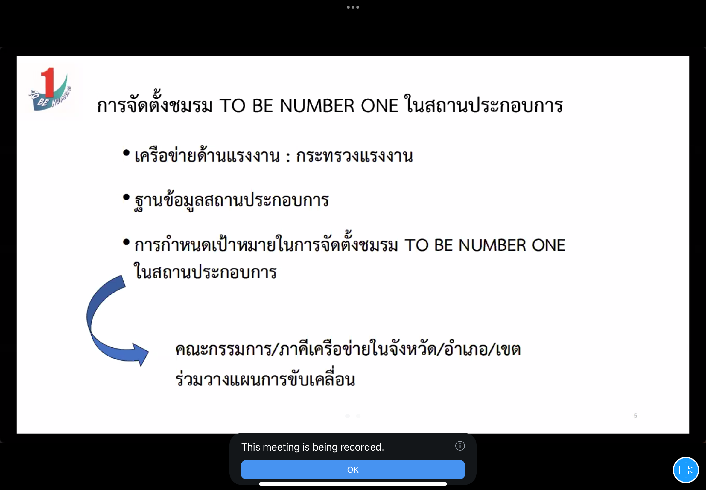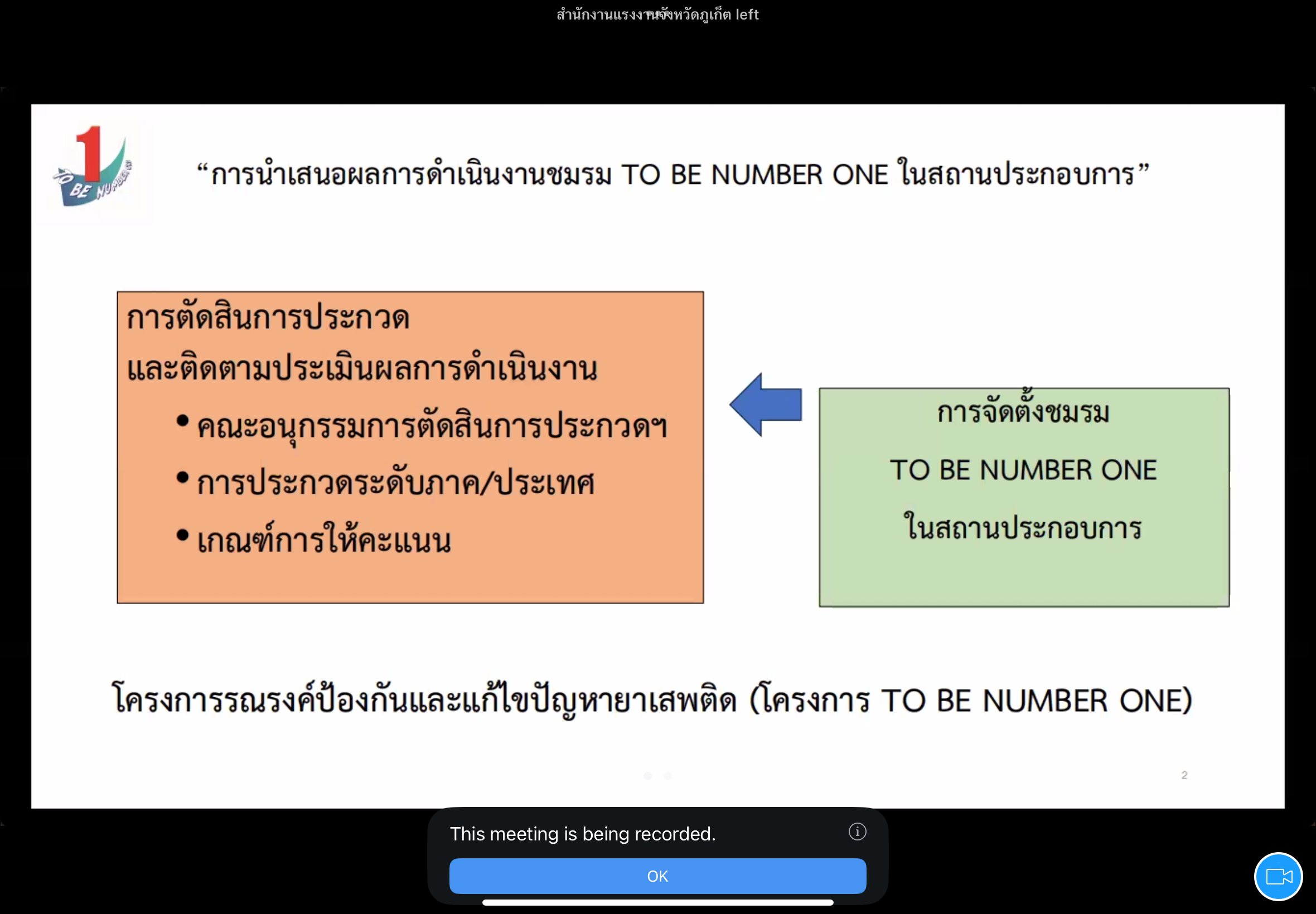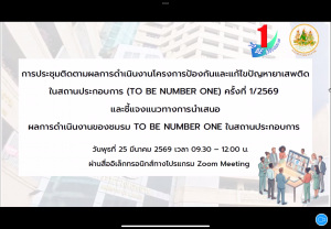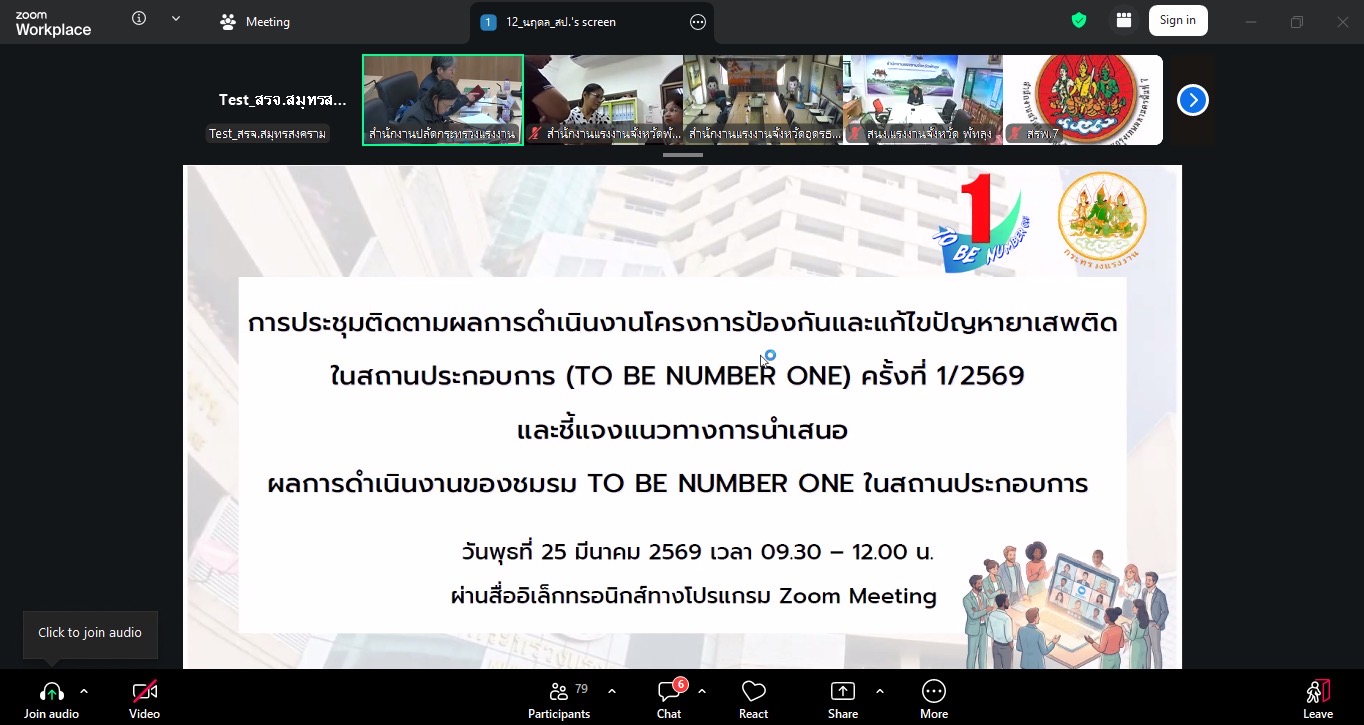 วันพุธที่ 25 มีนาคม 2569 เวลา 09.30 น. นางรภัสสา พานิกุล แรงงานจังหวัดสมุทรสงคราม พร้อมด้วย นางสาวลภัสนันท์ ลัดดาพรสวัสดิ์ นักวิชาการแรงงานชำนาญการ ร่วมประชุมติดตามผลการดำเนินงานโครงการป้องกันและแก้ไขปัญหายาเสพติดในสถานประกอบการ (To Be Number one) ครั้งที่ 1/2569 และชี้แจงแนวทางการนำเสนอผลการดำเนินงานชมรม TO BE NUMBER ONE ในสถานประกอบการ และติดตามผลการดำเนินงานตามแผนปฏิบัติงานโครงการป้องกันและแก้ไขปัญหายาเสพติดในสถานประกอบการ (To Be Number one) ประจำปีงบประมาณ 2569 ผ่านสื่ออิเล็กทรอนิกส์โปรแกรม Zoom Meeting จัดโดย กองยุทธศาสตร์และแผนงาน กลุ่มงานพัฒนายุทธศาสตร์ สำนักงานปลัดกระทรวงแรงงาน ณ ห้องประชุมสำนักงานแรงงานจังหวัดสมุทรสงคราม ชั้น 5 ศาลากลางจังหวัดสมุทรสงคราม