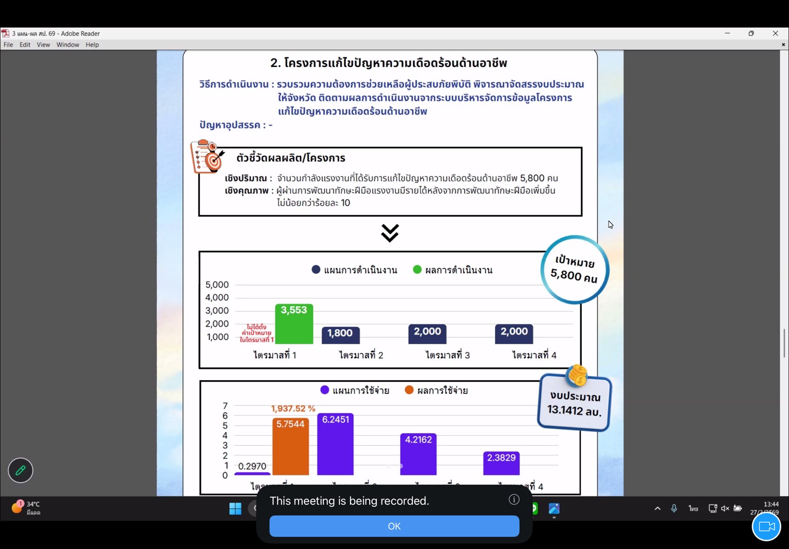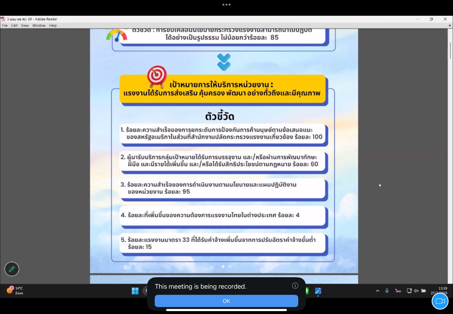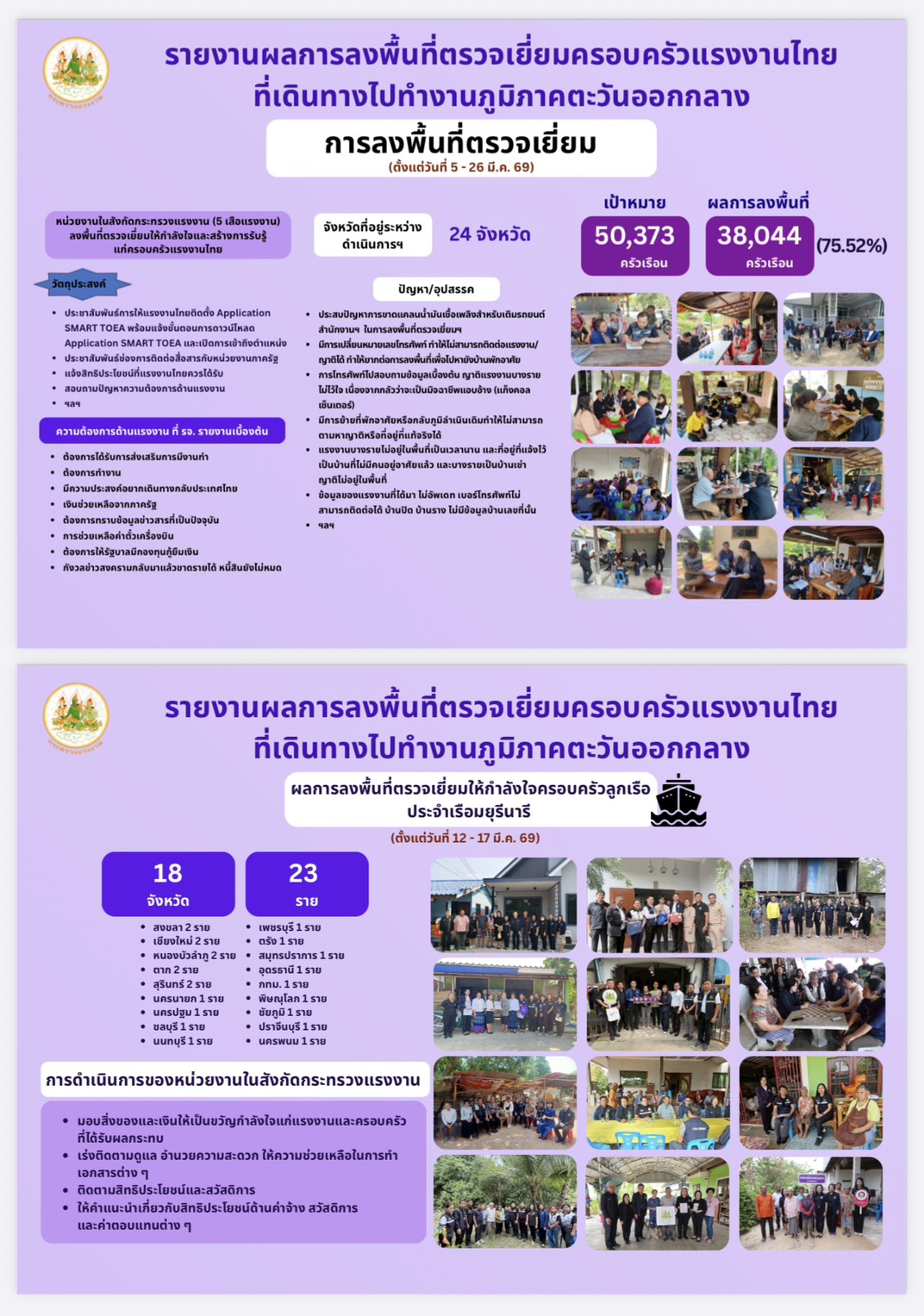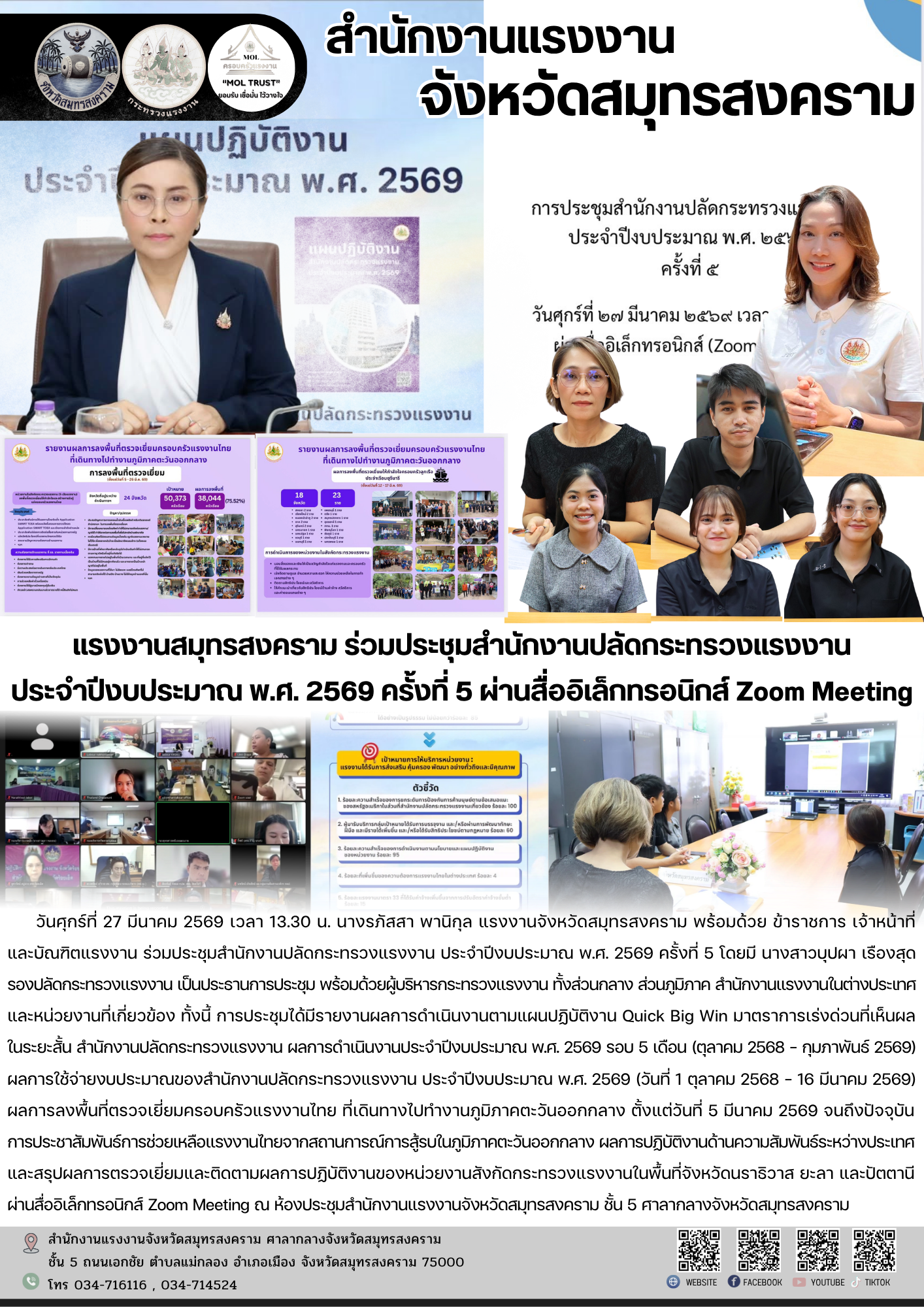 วันศุกร์ที่ 27 มีนาคม 2569 เวลา 13.30 น. นางรภัสสา พานิกุล แรงงานจังหวัดสมุทรสงคราม พร้อมด้วย ข้าราชการ เจ้าหน้าที่ และบัณฑิตแรงงาน ร่วมประชุมสำนักงานปลัดกระทรวงแรงงาน ประจำปีงบประมาณ พ.ศ. 2569 ครั้งที่ 5 โดยมี นางสาวบุปผา เรืองสุด รองปลัดกระทรวงแรงงาน เป็นประธานการประชุม พร้อมด้วยผู้บริหารกระทรวงแรงงาน ทั้งส่วนกลาง ส่วนภูมิภาค สำนักงานแรงงานในต่างประเทศ และหน่วยงานที่เกี่ยวข้อง ทั้งนี้ การประชุมได้มีรายงานผลการดำเนินงานตามแผนปฏิบัติงาน Quick Big Win มาตราการเร่งด่วนที่เห็นผล ในระยะสั้น สำนักงานปลัดกระทรวงแรงงาน ผลการดำเนินงานประจำปีงบประมาณ พ.ศ. 2569 รอบ 5 เดือน (ตุลาคม 2568 – กุมภาพันธ์ 2569) ผลการใช้จ่ายงบประมาณของสำนักงานปลัดกระทรวงแรงงาน ประจำปีงบประมาณ พ.ศ. 2569 (วันที่ 1 ตุลาคม 2568 – 16 มีนาคม 2569) ผลการลงพื้นที่ตรวจเยี่ยมครอบครัวแรงงานไทย ที่เดินทางไปทำงานภูมิภาคตะวันออกกลาง ตั้งแต่วันที่ 5 มีนาคม 2569 จนถึงปัจจุบัน การประชาสัมพันธ์การช่วยเหลือแรงงานไทยจากสถานการณ์การสู้รบในภูมิภาคตะวันออกกลาง ผลการปฏิบัติงานด้านความสัมพันธ์ระหว่างประเทศ และสรุปผลการตรวจเยี่ยมและติดตามผลการปฏิบัติงานของหน่วยงานสังกัดกระทรวงแรงงานในพื้นที่จังหวัดนราธิวาส ยะลา และปัตตานี ผ่านสื่ออิเล็กทรอนิกส์ Zoom Meeting ณ ห้องประชุมสำนักงานแรงงานจังหวัดสมุทรสงคราม ชั้น 5 ศาลากลางจังหวัดสมุทรสงคราม