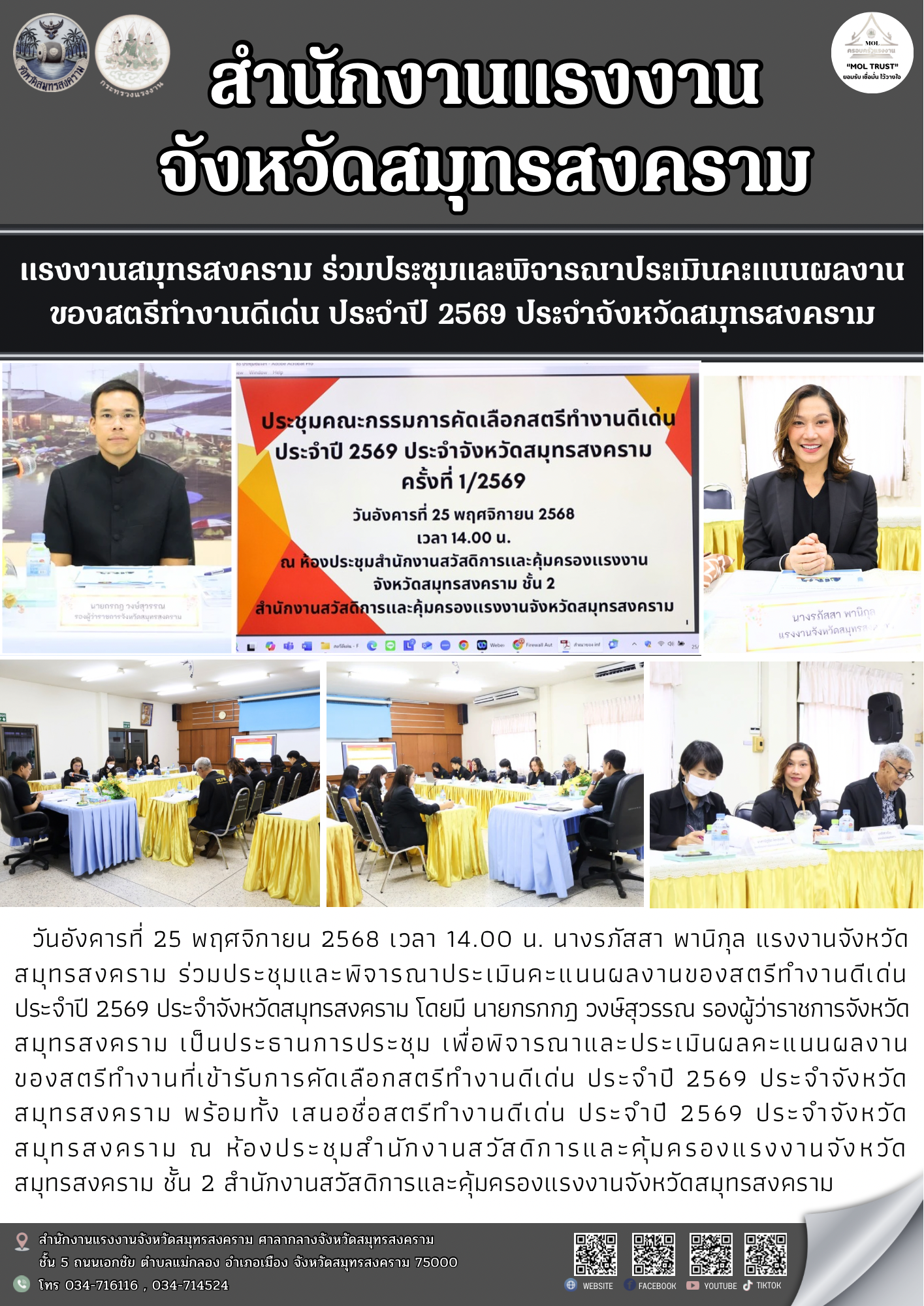 ผลงานของสตรีทำงานดีเด่นประจำปี 2569 ประจำจังหวัดสมุทรสงคราม โดยมี นายกรกกฎ วงษ์สุวรรณ รองผู้ว่าราชการจังหวัดสมุทรสงคราม เป็นประธานการประชุม เพื่อพิจารณาและประเมินผลคะแนนผลงานของสตรีทำงานที่เข้ารับการคัดเลือกสตรีทำงานดีเด่น ประจำปี 2569