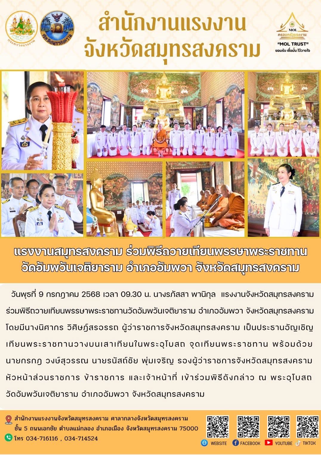 วันพุธที่ 9 กรกฎาคม 2568 เวลา 09.30 น. นางรภัสสา พานิกุล แรงงานจังหวัดสมุทรสงคราม ร่วมพิธีถวายเทียนพรรษาพระราชทานวัดอัมพวันเจติยาราม อำเภออัมพวา จังหวัดสมุทรสงคราม โดยมีนางนิศากร วิศิษฎ์สรอรรถ ผู้ว่าราชการจังหวัดสมุทรสงคราม เป็นประธานอัญเชิญเทียนพระราชทานวางบนเสาเทียนในพระอุโบสถ จุดเทียนพระราชทาน พร้อมด้วย นายกรกฎ วงษ์สุวรรณ นายรนัสถ์ชัย พุ่มเจริญ รองผู้ว่าราชการจังหวัดสมุทรสงคราม หัวหน้าส่วนราชการ ข้าราชการ และเจ้าหน้าที่ เข้าร่วมพิธีดังกล่าว ณ พระอุโบสถวัดอัมพวันเจติยาราม อำเภออัมพวา จังหวัดสมุทรสงคราม