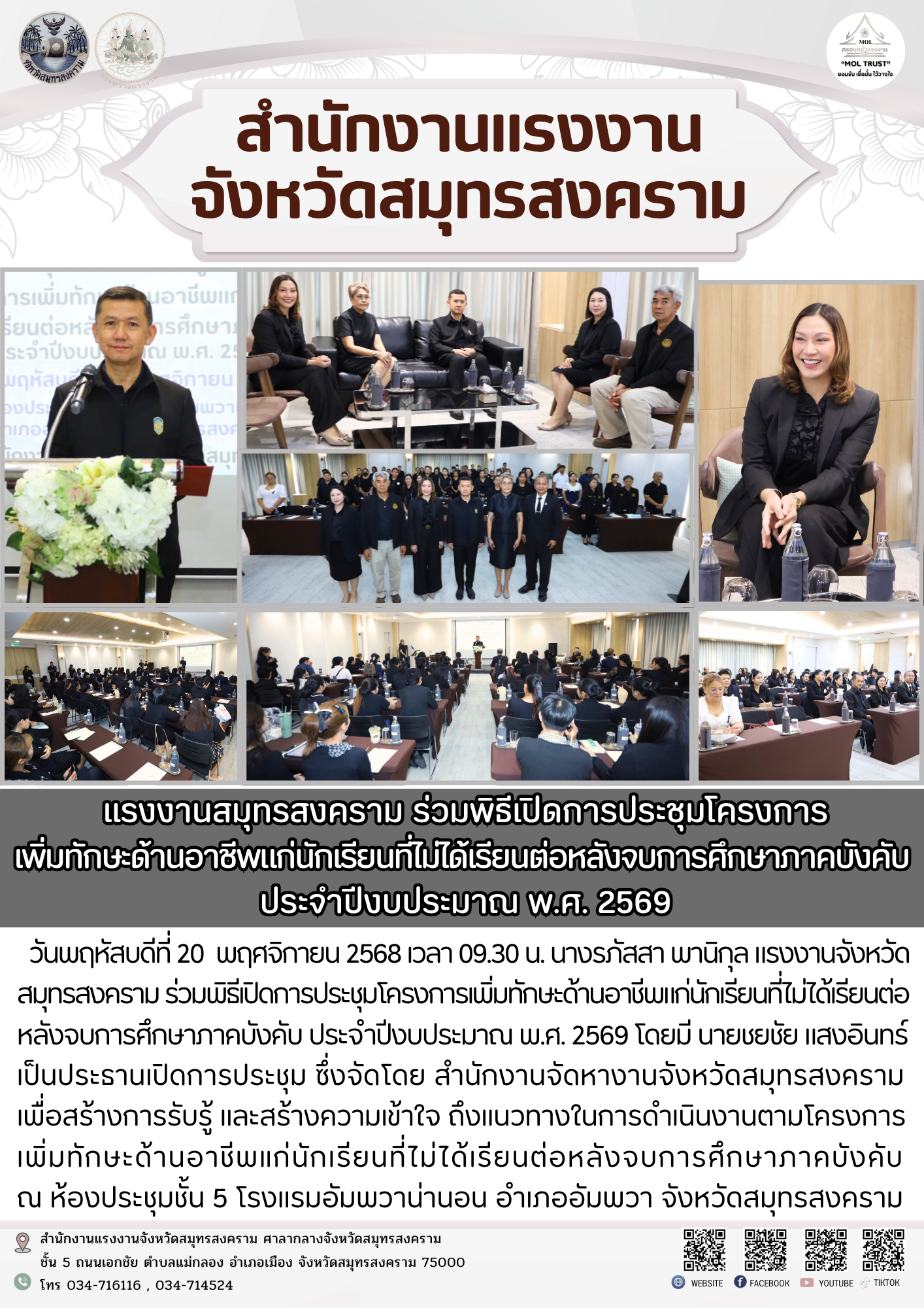 วันพฤหัสบดีที่ 20 พฤศจิกายน 2568 เวลา 09.30 น. นางรภัสสา พานิกุล แรงงานจังหวัดสมุทรสงคราม ร่วมพิธีเปิดการประชุมโครงการเพิ่มทักษะด้านอาชีพแก่นักเรียนที่ไม่ได้เรียนต่อหลังจบการศึกษาภาคบังคับ ประจำปีงบประมาณ พ.ศ. 2569 โดยมีนายชยชัย แสงอินทร์ เป็นประธานเปิดการประชุม ซึ่งจัดโดย สำนักงานจัดหางานจังหวัดสมุทรสงคราม เพื่อสร้างการรับรู้ และสร้างความเข้าใจ ถึงแนวทางในการดำเนินงานตามโครงการเพิ่มทักษะด้านอาชีพแก่นักเรียนที่ไม่ได้เรียนต่อหลังจบการศึกษาภาคบังคับณ ห้องประชุมชั้น 5 โรงแรมอัมพวาน่านอน อำเภออัมพวา จังหวัดสมุทรสงคราม