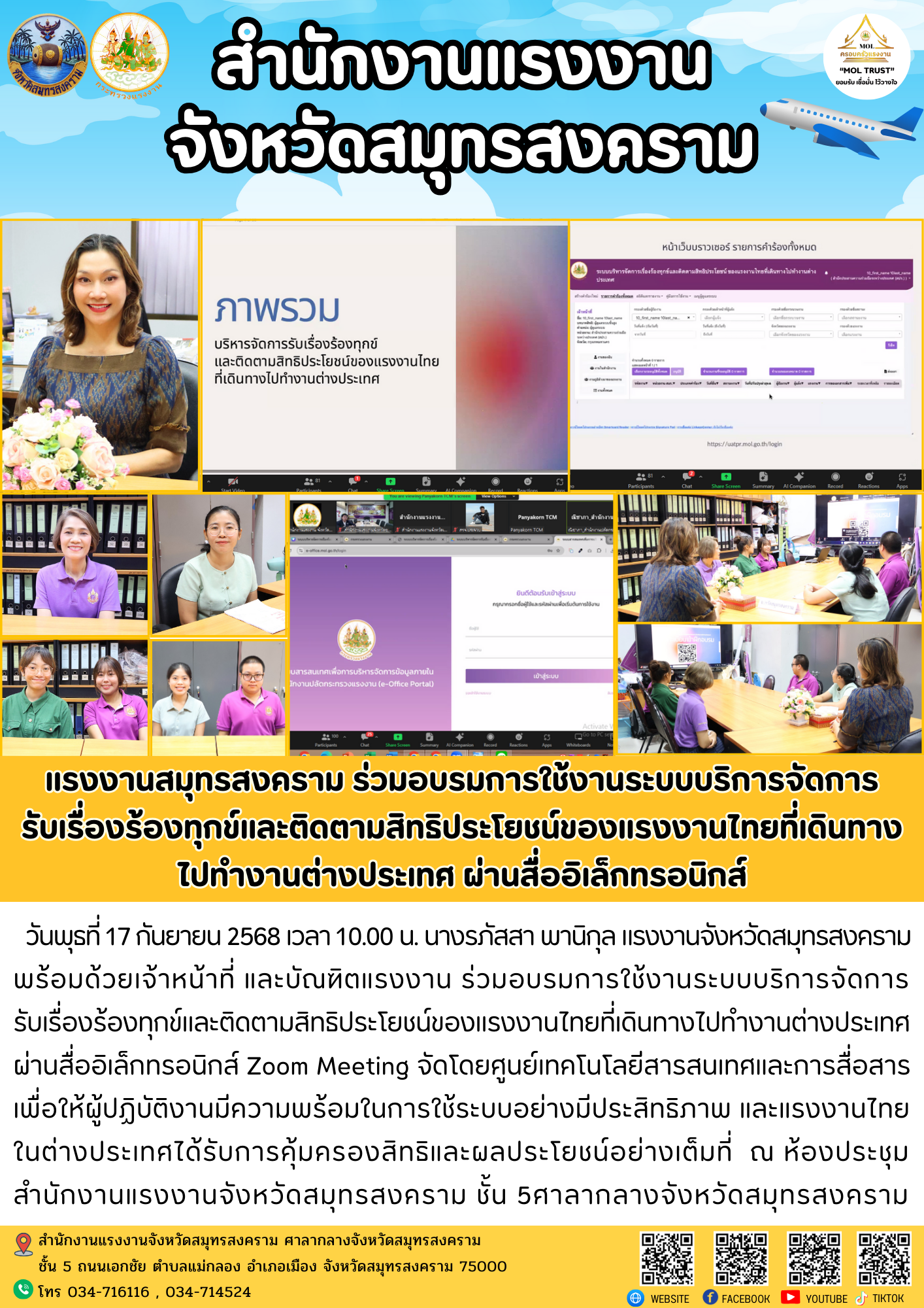 วันพุธที่ 17 กันยายน 2568 เวลา 10.00 น. นางรภัสสา พานิกุล แรงงานจังหวัดสมุทรสงคราม พร้อมด้วยเจ้าหน้าที่ และบัณฑิตแรงงาน ร่วมอบรมการใช้งานระบบบริการจัดการรับเรื่องร้องทุกข์และติดตามสิทธิประโยชน์ของแรงงานไทยที่เดินทางไปทำงานต่างประเทศ ผ่านสื่ออิเล็กทรอนิกส์ Zoom Meeting จัดโดยศูนย์เทคโนโลยีสารสนเทศและการสื่อสาร เพื่อให้ผู้ปฏิบัติงานมีความพร้อมในการใช้ระบบอย่างมีประสิทธิภาพ และแรงงานไทยในต่างประเทศได้รับการคุ้มครองสิทธิและผลประโยชน์อย่างเต็มที่ ณ ห้องประชุมสำนักงานแรงงานจังหวัดสมุทรสงคราม ชั้น 5ศาลากลางจังหวัดสมุทรสงคราม
