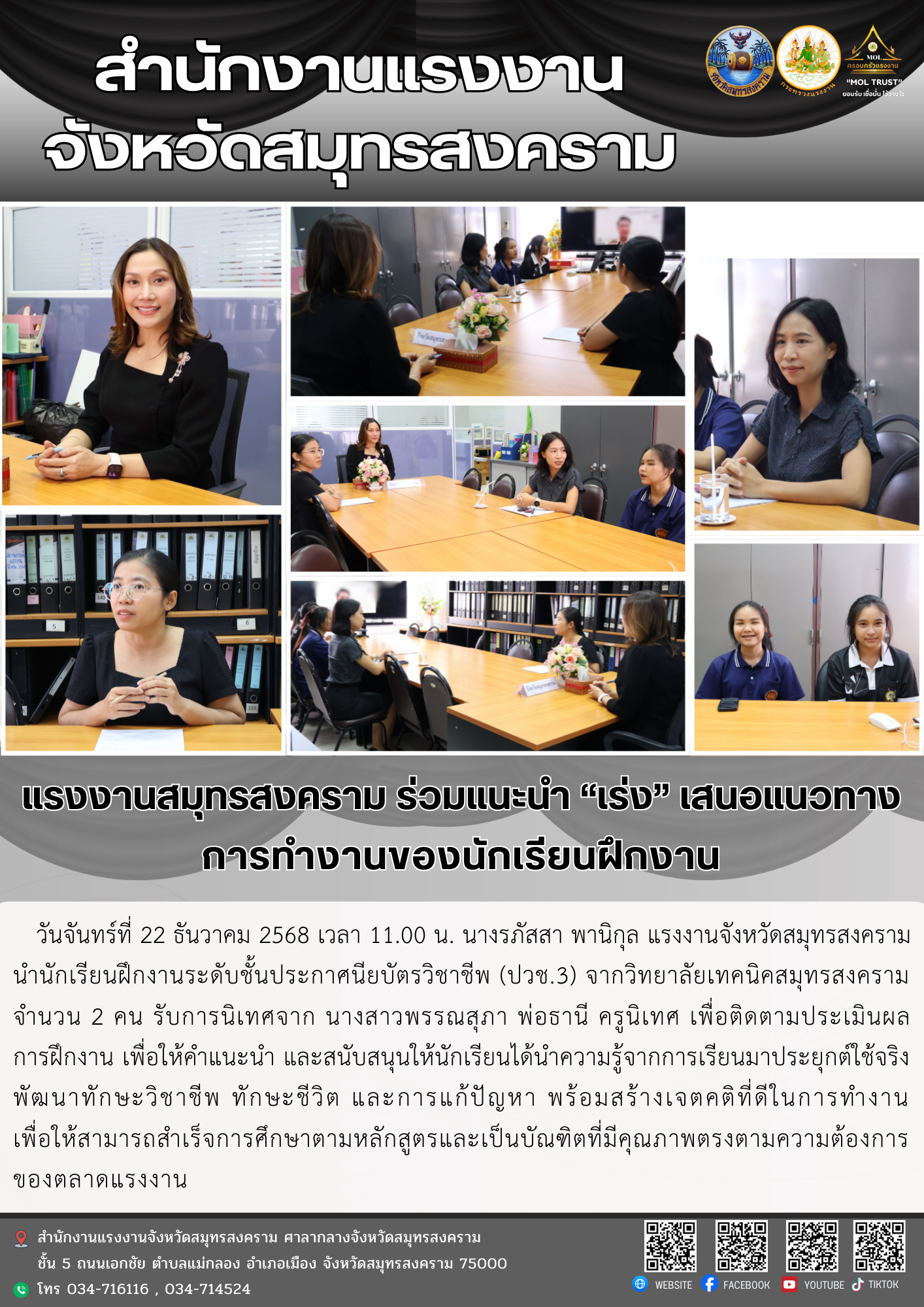 วันจันทร์ที่ 22 ธันวาคม 2568 เวลา 11.00 น. นางรภัสสา พานิกุล แรงงานจังหวัดสมุทรสงคราม