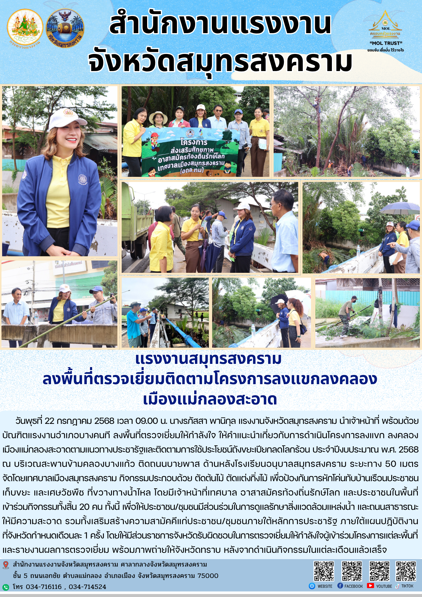 วันพุธที่ 22 กรกฏาคม 2568 เวลา 09.00 น. นางรภัสสา พานิกุล แรงงานจังหวัดสมุทรสงคราม นำเจ้าหน้าที่ พร้อมด้วย บัณฑิตแรงงานอำเภอบางคนที ลงพื้นที่ตรวจเยี่ยมให้กำลังใจ ให้คำแนะนำเกี่ยวกับการดำเนินโครงการลงแขก ลงคลอง เมืองแม่กลองสะอาดตามแนวทางประชารัฐและติดตามการใช้ประโยชน์ถังขยะเปียกลดโลกร้อน ประจำปีงบประมาณ พ.ศ. 2568 ณ บริเวณสะพานข้ามคลองบางแก้ว ติดถนนบายพาส ด้านหลังโรงเรียนอนุบาลสมุทรสงคราม ระยะทาง 50 เมตร จัดโดยเทศบาลเมืองสมุทรสงคราม กิจกรรมประกอบด้วย ตัดต้นไม้ ตัดแต่งกิ่งไม้ เพื่อป้องกันการหักโค่นทับบ้านเรือนประชาชน เก็บขยะ และเศษวัชพืช ที่ขวางทางน้ำไหล โดยมีเจ้าหน้าที่เทศบาล อาสาสมัครท้องถิ่นรักษ์โลก และประชาชนในพื้นที่ เข้าร่วมกิจกรรมทั้งสิ้น 20 คน ทั้งนี้ เพื่อให้ประชาชน/ชุมชนมีส่วนร่วมในการดูแลรักษาสิ่งแวดล้อมแหล่งน้ำ และถนนสาธารณะ ให้มีความสะอาด รวมทั้งเสริมสร้างความสามัคคีแก่ประชาชน/ชุมชนภายใต้หลักการประชารัฐ ภายใต้แผนปฏิบัติงานที่จังหวัดกำหนดเดือนละ 1 ครั้ง โดยให้มีส่วนราชการจังหวัดรับผิดชอบในการตรวจเยี่ยมให้กำลังใจผู้เข้าร่วมโครงการแต่ละพื้นที่ และรายงานผลการตรวจเยี่ยม พร้อมภาพถ่ายให้จังหวัดทราบ หลังจากดำเนินกิจกรรมในแต่ละเดือนแล้วเสร็จ