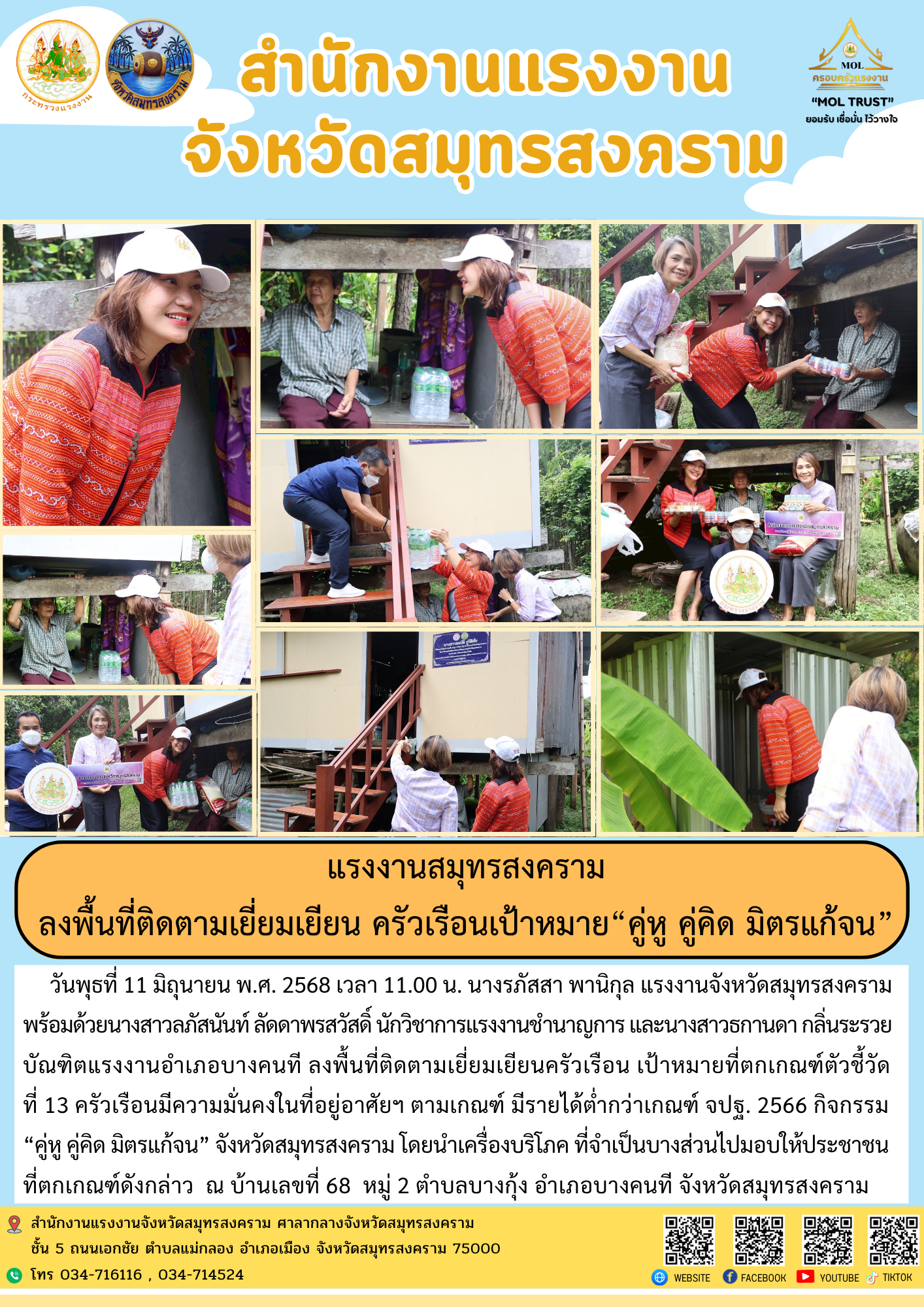 วันพุธที่ 11 มิถุนายน พ.ศ. 2568 เวลา 11.00 น. นางรภัสสา พานิกุล แรงงานจังหวัดสมุทรสงคราม พร้อมด้วยนางสาวลภัสนันท์ ลัดดาพรสวัสดิ์ นักวิชาการแรงงานชำนาญการ และนางสาวธกานดา กลิ่นระรวย บัณฑิตแรงงานอำเภอบางคนที ลงพื้นที่ติดตามเยี่ยมเยียนครัวเรือน เป้าหมายที่ตกเกณฑ์ตัวชี้วัด ที่ 13 ครัวเรือนมีความมั่นคงในที่อยู่อาศัยฯ ตามเกณฑ์ มีรายได้ต่ำกว่าเกณฑ์ จปฐ. 2566 กิจกรรม “คู่หู คู่คิด มิตรแก้จน” จังหวัดสมุทรสงคราม โดยนำเครื่องบริโภค ที่จำเป็นบางส่วนไปมอบให้ประชาชนที่ตกเกณฑ์ดังกล่าว ณ บ้านเลขที่ 68 หมู่ 2 ตำบลบางกุ้ง อำเภอบางคนที จังหวัดสมุทรสงคราม