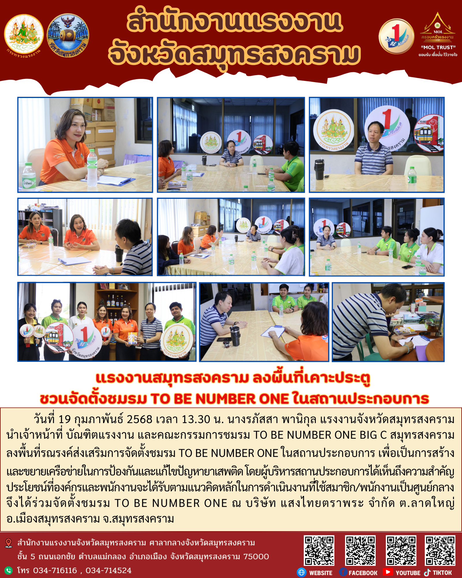 วันที่ 19 กุมภาพันธ์ 2568 เวลา 13.30 น. นางรภัสสา พานิกุล แรงงานจังหวัดสมุทรสงคราม นำเจ้าหน้าที่ บัณฑิตแรงงาน และคณะกรรมการชมรม TO BE NUMBER ONE BIG C สมุทรสงคราม ลงพื้นที่รณรงค์ส่งเสริมการจัดตั้งชมรม TO BE NUMBER ONE ในสถานประกอบการ เพื่อเป็นการสร้าง และขยายเครือข่ายในการป้องกันและแก้ไขปัญหายาเสพติด โดยผู้บริหารสถานประกอบการได้เห็นถึงความสำคัญ ประโยชน์ที่องค์กรและพนักงานจะได้รับตามแนวคิดหลักในการดำเนินงานที่ใช้สมาชิก/พนักงานเป็นศูนย์กลาง จึงได้ร่วมจัดตั้งชมรม TO BE NUMBER ONE ณ บริษัท แสงไทยตราพระ จำกัด ต.ลาดใหญ่ อ.เมืองสมุทรสงคราม จ.สมุทรสงคราม