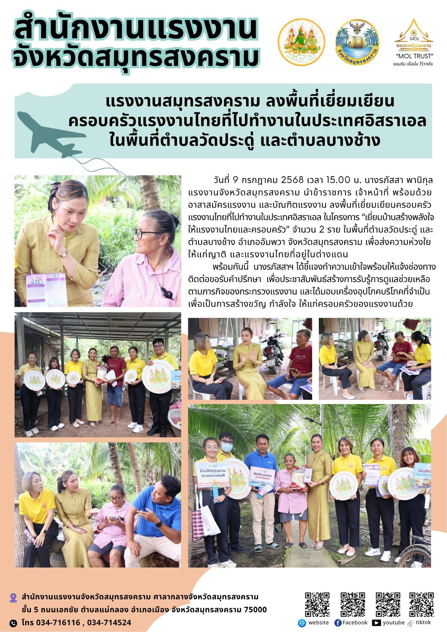 วันที่ 9 กรกฎาคม 2568 เวลา 15.00 น. นางรภัสสา พานิกุล แรงงานจังหวัดสมุทรสงคราม นำข้าราชการ เจ้าหน้าที่ พร้อมด้วยอาสาสมัครแรงงาน และบัณฑิตแรงงาน ลงพื้นที่เยี่ยมเยียนครอบครัวแรงงานไทยที่ไปทำงานในประเทศอิสราเอล ในโครงการ “เยี่ยมบ้านสร้างพลังใจ