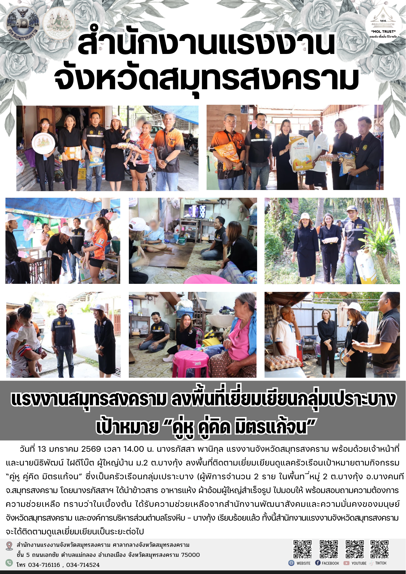 วันที่ 13 มกราคม 2569 นางรภัสสา พานิกุล แรงงานจังหวัดสมุทรสงคราม พร้อมด้วยเจ้าหน้าที่ และนายนิธิพัฒน์ ไฝดีโบ๊ต ผู้ใหญ่บ้าน ม.2 ต.บางกุ้ง ลงพื้นที่ติดตามเยี่ยมเยียนดูแลครัวเรือนเป้าหมายตามกิจกรรม คู่หู คู่คิด มิตรแก้จน ซึ่งเป็นครัวเรือนกลุ่มเปราะบาง (ผู้พิการจำนวน 2 ราย ในพื้นที่หมู่ 2 ต.บางกุ้ง อ.บางคนที จ.สมุทรสงคราม โดยนางรภัสสาฯ ได้นำข้าวสาร อาหารแห้ง ผ้าอ้อมผู้ใหญ่สำเร็จรูปไปมอบให้ พร้อมสอบถามความต้องการความช่วยเหลือ ทราบว่าในเบื้องต้น ได้รับความช่วยเหลือจากสำนักงานพัฒนาสังคมและความมั่นคงของมนุษย์จังหวัดสมุทรสงคราม และองค์การบริหารส่วนตำบลโรงหีบ – บางกุ้ง เรียบร้อยแล้ว ทั้งนี้สำนักงานแรงงานจังหวัดสมุทรสงครามจะได้ติดตามดูแลเยี่ยมเยียนเป็นระยะต่อไป