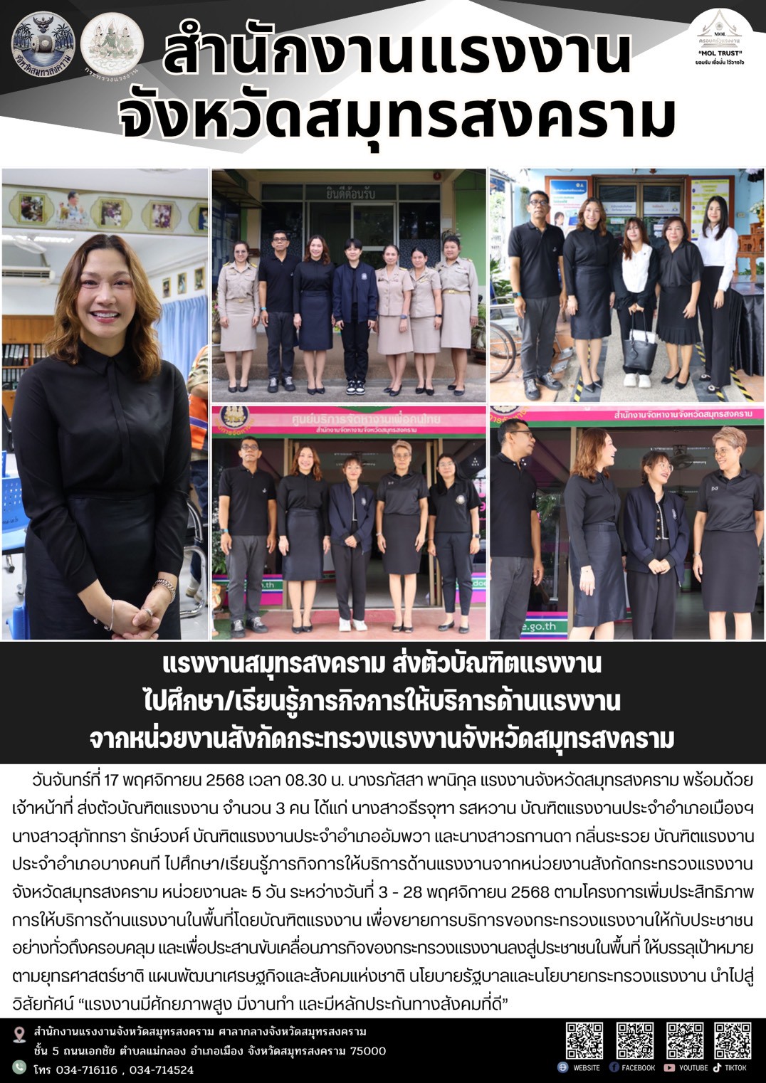 วันจันทร์ที่ 17 พฤศจิกายน 2568 เวลา 08.30 น. นางรภัสสา พานิกุล แรงงานจังหวัดสมุทรสงคราม พร้อมด้วยเจ้าหน้าที่ ส่งตัวบัณฑิตแรงงาน จำนวน 3 คน ได้แก่ นางสาวธีรจุฑา รสหวาน บัณฑิตแรงงานประจำอำเภอเมืองฯ นางสาวสุภัททรา รักษ์วงศ์ บัณฑิตแรงงานประจำอำเภออัมพวา และนางสาวธกานดา กลิ่นระรวย บัณฑิตแรงงานประจำอำเภอบางคนที ไปศึกษา/เรียนรู้ภารกิจการให้บริการด้านแรงงานจากหน่วยงานสังกัดกระทรวงแรงงานจังหวัดสมุทรสงคราม หน่วยงานละ 5 วัน ระหว่างวันที่ 3 – 28 พฤศจิกายน 2568 ตามโครงการเพิ่มประสิทธิภาพการให้บริการด้านแรงงานในพื้นที่โดยบัณฑิตแรงงาน เพื่อขยายการบริการของกระทรวงแรงงานให้กับประชาชนอย่างทั่วถึงครอบคลุม และเพื่อประสานขับเคลื่อนภารกิจของกระทรวงแรงงานลงสู่ประชาชนในพื้นที่ ให้บรรลุเป้าหมายตามยุทธศาสตร์ชาติ แผนพัฒนาเศรษฐกิจและสังคมแห่งชาติ นโยบายรัฐบาลและนโยบายกระทรวงแรงงาน นำไปสู่วิสัยทัศน์ “แรงงานมีศักยภาพสูง มีงานทำ และมีหลักประกันทางสังคมที่ดี”