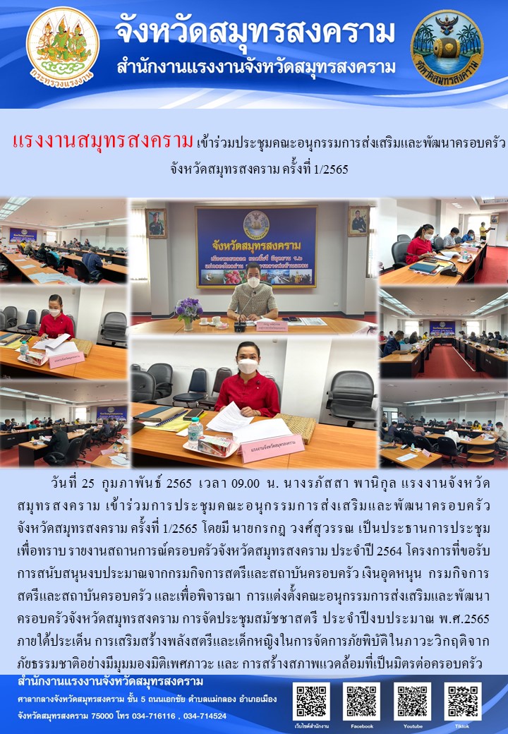 วันที่ 25 กุมภาพันธ์ 2565 เวลา 09.00 น. นางรภัสสา พานิกุล แรงงานจังหวัดสมุทรสงคราม เข้าร่วมการประชุมคณะอนุกรรมการส่งเสริมและพัฒนาครอบครัว จังหวัดสมุทรสงคราม ครั้งที่ 1/2565 โดยมี นายกรกฎ วงศ์สุวรรณ เป็นประธานการประชุม เพื่อทราบ รายงานสถานการณ์ครอบครัวจังหวัดสมุทรสงคราม ประจำปี 2564 โครงการที่ขอรับการสนับสนุนงบประมาณจากกรมกิจการสตรีและสถาบันครอบครัว เงินอุดหนุน กรมกิจการสตรีและสถาบันครอบครัว และเพื่อพิจารณา การแต่งตั้งคณะอนุกรรมการส่งเสริมและพัฒนาครอบครัวจังหวัดสมุทรสงคราม การจัดประชุมสมัชชาสตรี ประจำปีงบประมาณ พ.ศ.2565 ภายใต้ประเด็น การเสริมสร้างพลังสตรีและเด็กหญิงในการจัดการภัยพิบัติในภาวะวิกฤติจากภัยธรรมชาติอย่างมีมุมมองมิติเพศภาวะ และ การสร้างสภาพแวดล้อมที่เป็นมิตรต่อครอบครัว