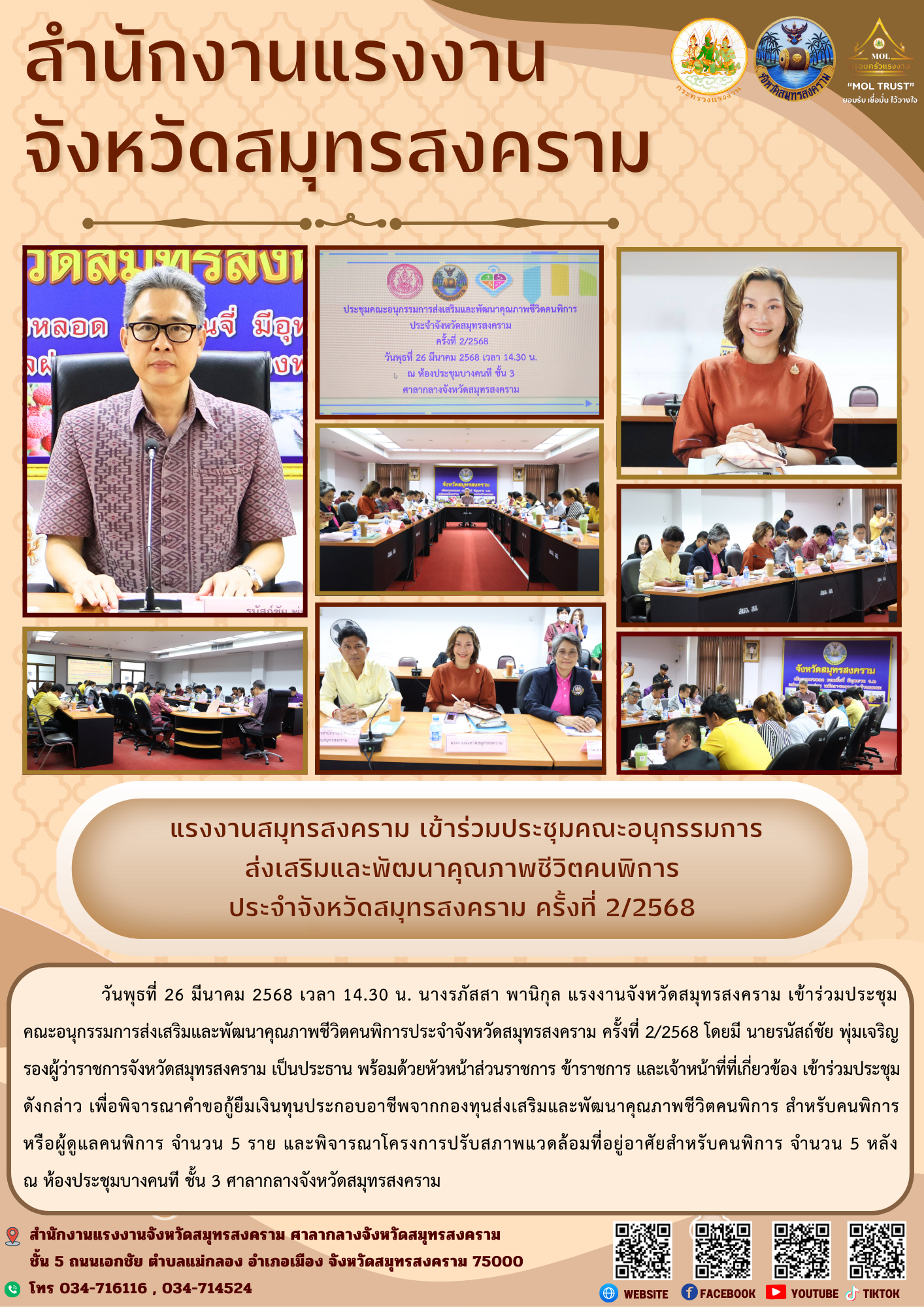 วันพุธที่ 26 มีนาคม 2568 เวลา 14.30 น. นางรภัสสา พานิกุล แรงงานจังหวัดสมุทรสงคราม เข้าร่วมประชุมคณะอนุกรรมการส่งเสริมและพัฒนาคุณภาพชีวิตคนพิการประจำจังหวัดสมุทรสงคราม ครั้งที่ 2/2568 โดยมี นายรนัสถ์ชัย พุ่มเจริญ รองผู้ว่าราชการจังหวัดสมุทรสงคราม เป็นประธาน พร้อมด้วยหัวหน้าส่วนราชการ ข้าราชการ และเจ้าหน้าที่ที่เกี่ยวข้อง เข้าร่วมประชุมดังกล่าว เพื่อพิจารณาคำขอกู้ยืมเงินทุนประกอบอาชีพจากกองทุนส่งเสริมและพัฒนาคุณภาพชีวิตคนพิการ สำหรับคนพิการ หรือผู้ดูแลคนพิการ จำนวน 5 ราย และพิจารณาโครงการปรับสภาพแวดล้อมที่อยู่อาศัยสำหรับคนพิการ จำนวน 5 หลัง ณ ห้องประชุมบางคนที ชั้น 3 ศาลากลางจังหวัดสมุทรสงคราม