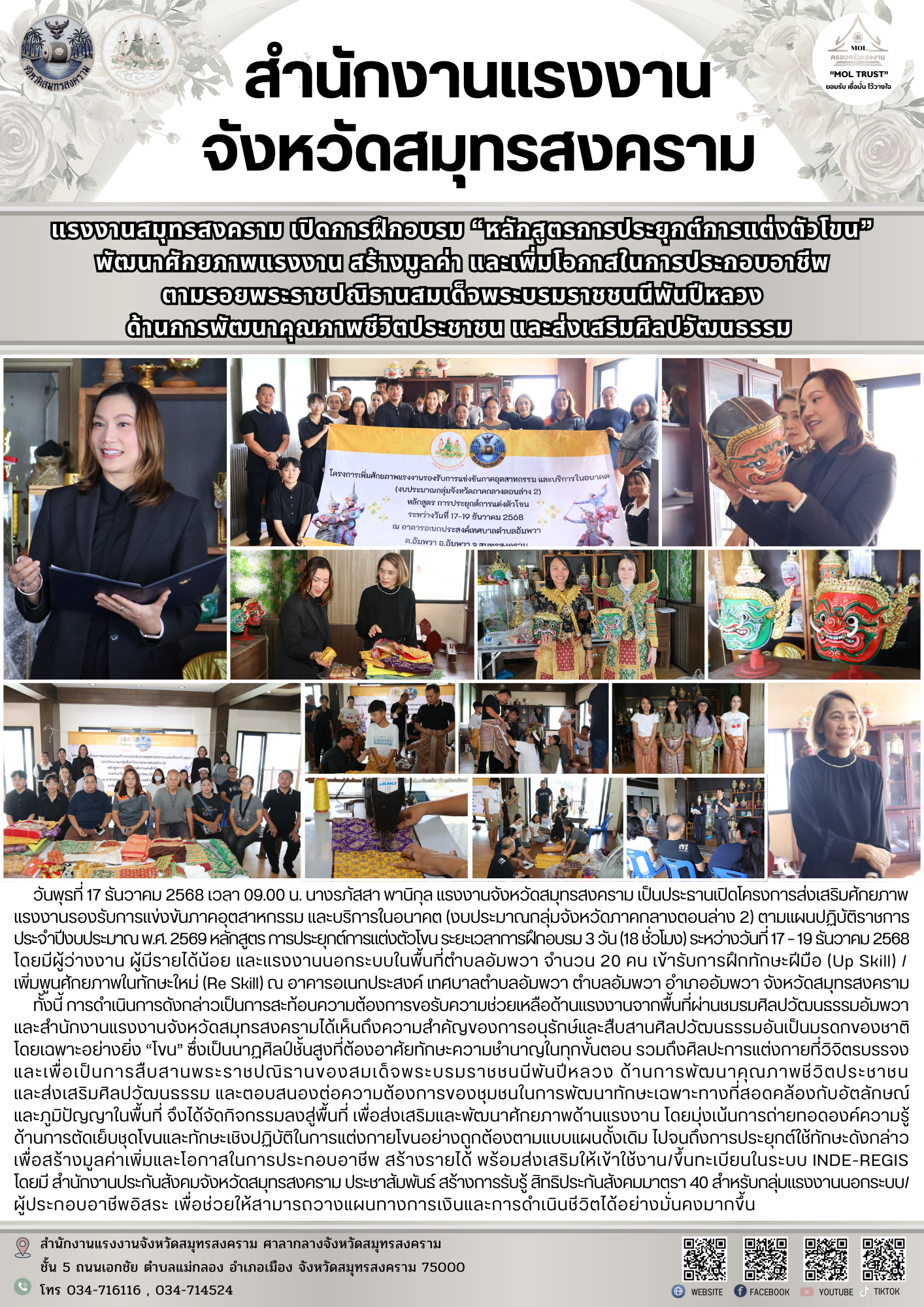 วันพุธที่ 17 ธันวาคม 2568 เวลา 09.00 น. นางรภัสสา พานิกุล แรงงานจังหวัดสมุทรสงคราม เป็นประธานเปิดโครงการส่งเสริมศักยภาพแรงงานรองรับการแข่งขันภาคอุตสาหกรรม และบริการในอนาคต (งบประมาณกลุ่มจังหวัดภาคกลางตอนล่าง 2) ตามแผนปฏิบัติราชการ ประจำปีงบประมาณ พ.ศ. 2569 หลักสูตร การประยุกต์การแต่งตัวโขน ระยะเวลาการฝึกอบรม 3 วัน (18 ชั่วโมง) ระหว่างวันที่ 17 – 19 ธันวาคม 2568 โดยมีผู้ว่างงาน ผู้มีรายได้น้อย และแรงงานนอกระบบในพื้นที่ตำบลอัมพวา จำนวน 20 คน เข้ารับการฝึกทักษะฝีมือ (Up Skill) / เพิ่มพูนศักยภาพในทักษะใหม่ (Re Skill) ณ อาคารอเนกประสงค์ เทศบาลตำบลอัมพวา ตำบลอัมพวา อำเภออัมพวา จังหวัดสมุทรสงคราม