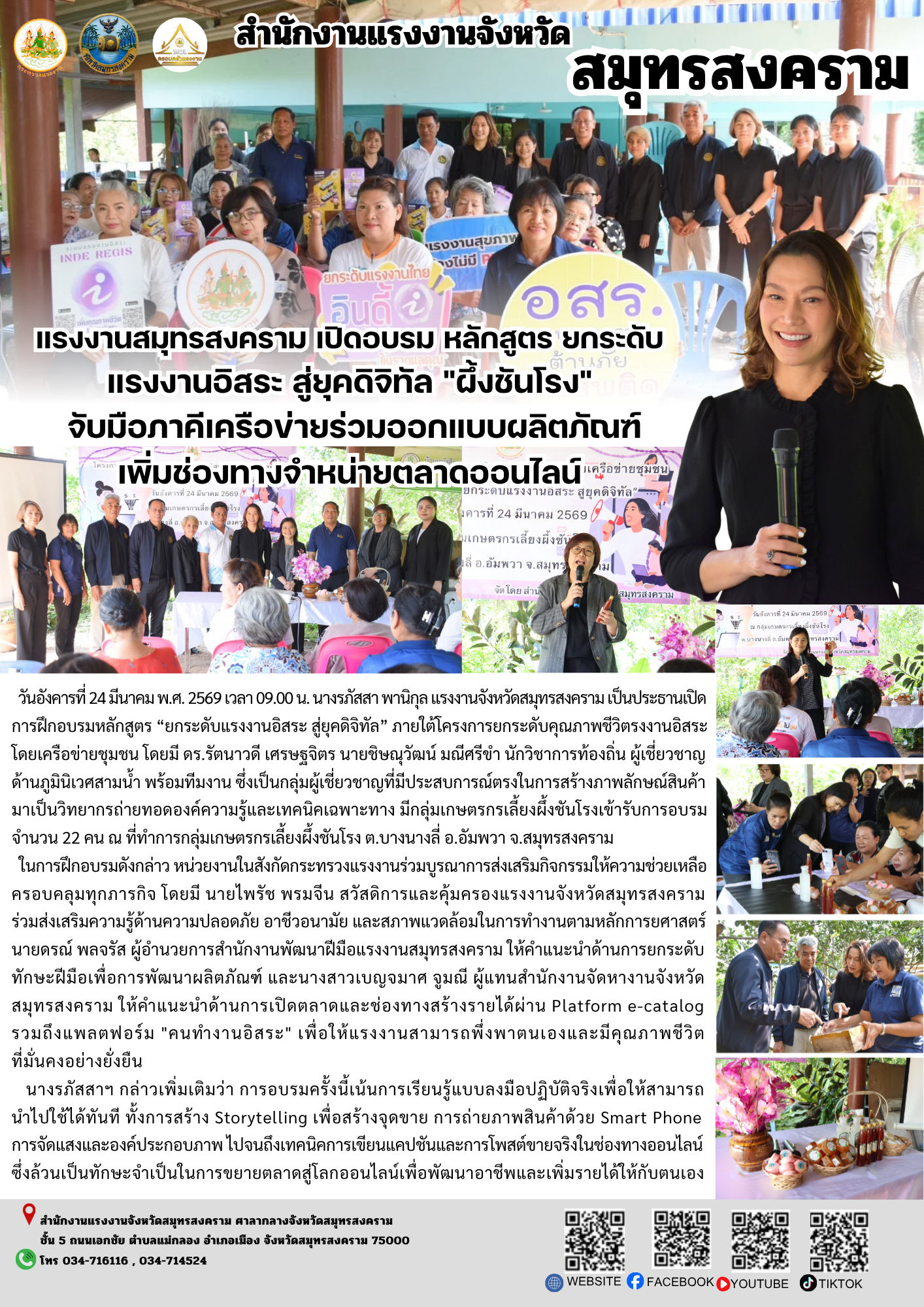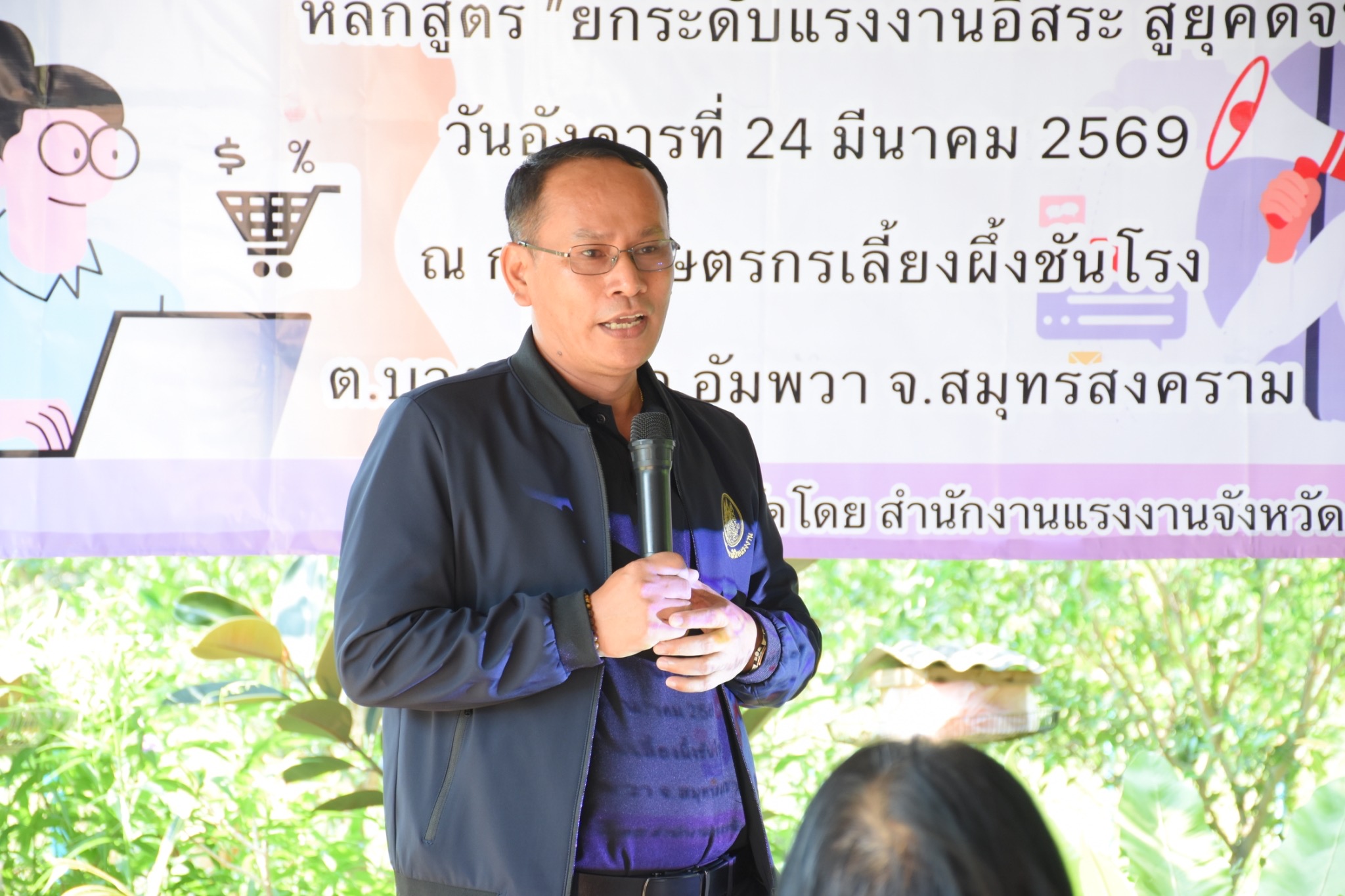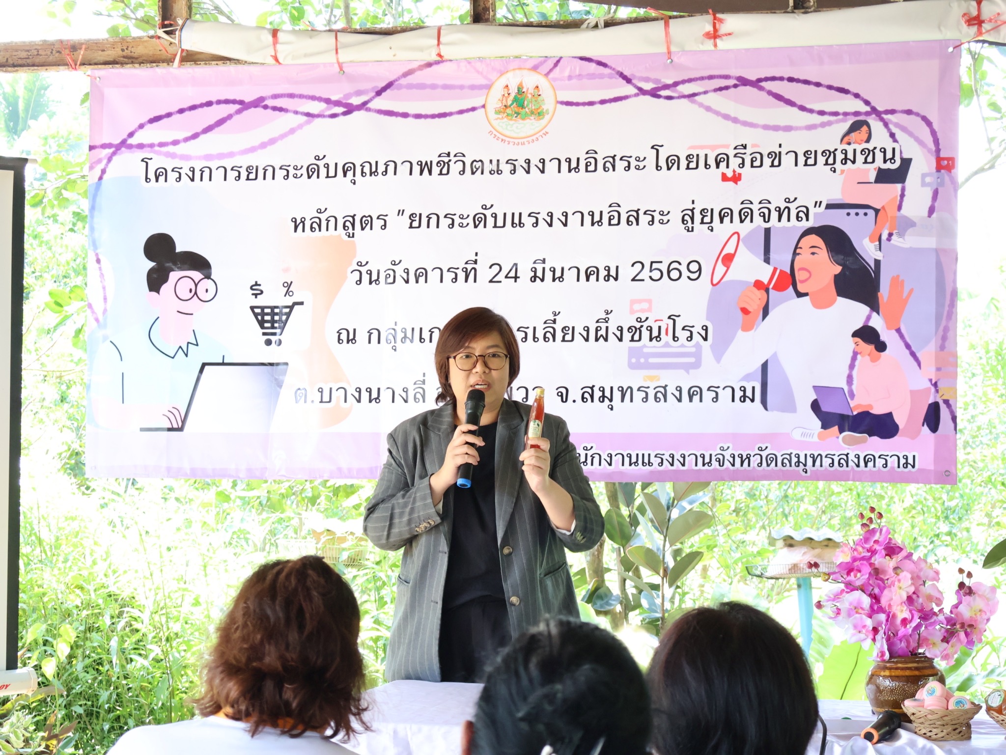 วันอังคารที่ 24 มีนาคม พ.ศ. 2569 เวลา 09.00 น. นางรภัสสา พานิกุล แรงงานจังหวัดสมุทรสงคราม เป็นประธานเปิดการฝึกอบรมหลักสูตร “ยกระดับแรงงานอิสระ สู่ยุคดิจิทัล” ภายใต้โครงการยกระดับคุณภาพชีวิตรงงานอิสระโดยเครือข่ายชุมชน โดยมี ดร.รัตนาวดี เศรษฐจิตร นายชิษณุวัฒน์ มณีศรีขำ นักวิชาการท้องถิ่น ผู้เชี่ยวชาญด้านภูมินิเวศสามน้ำ พร้อมทีมงาน ซึ่งเป็นกลุ่มผู้เชี่ยวชาญที่มีประสบการณ์ตรงในการสร้างภาพลักษณ์สินค้ามาเป็นวิทยากรถ่ายทอดองค์ความรู้และเทคนิคเฉพาะทาง มีกลุ่มเกษตรกรเลี้ยงผึ้งชันโรงเข้ารับการอบรมจำนวน 22 คน ณ ที่ทำการกลุ่มเกษตรกรเลี้ยงผึ้งชันโรง ต.บางนางลี่ อ.อัมพวา จ.สมุทรสงคราม