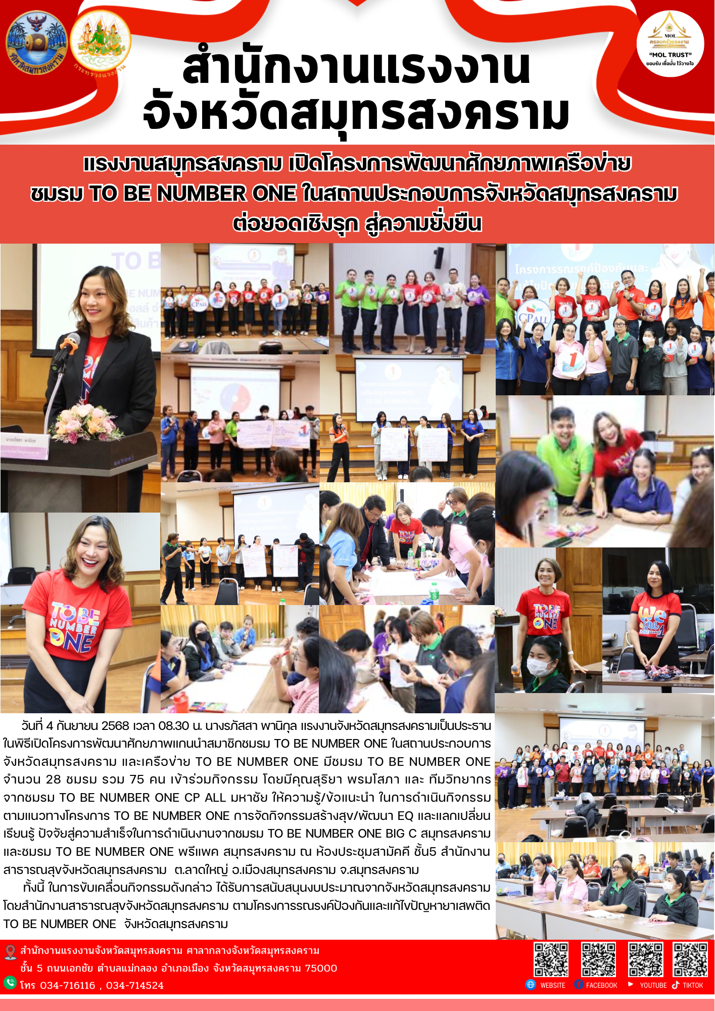 วันที่ 4 กันยายน 2568 เวลา 08.30 น. นางรภัสสา พานิกุล แรงงานจังหวัดสมุทรสงครามเป็นประธานในพิธีเปิดโครงการพัฒนาศักยภาพแกนนำสมาชิกชมรม TO BE NUMBER ONE ในสถานประกอบการจังหวัดสมุทรสงคราม และเครือข่าย TO BE NUMBER ONE มีชมรม TO BE NUMBER ONE จำนวน 28 ชมรม รวม 75 คน เข้าร่วมกิจกรรม โดยมีคุณสุริยา พรมโสภา และ ทีมวิทยากรจากชมรม TO BE NUMBER ONE CP ALL มหาชัย ให้ความรู้/ข้อแนะนำ ในการดำเนินกิจกรรมตามแนวทางโครงการ TO BE NUMBER ONE การจัดกิจกรรมสร้างสุข/พัฒนา EQ และแลกเปลี่ยนเรียนรู้ ปัจจัยสู่ความสำเร็จในการดำเนินงานจากชมรม TO BE NUMBER ONE BIG C สมุทรสงคราม และชมรม TO BE NUMBER ONE พรีแพค สมุทรสงคราม ณ ห้องประชุมสามัคคี ชั้น5 สำนักงานสาธารณสุขจังหวัดสมุทรสงคราม ต.ลาดใหญ่ อ.เมืองสมุทรสงคราม จ.สมุทรสงคราม