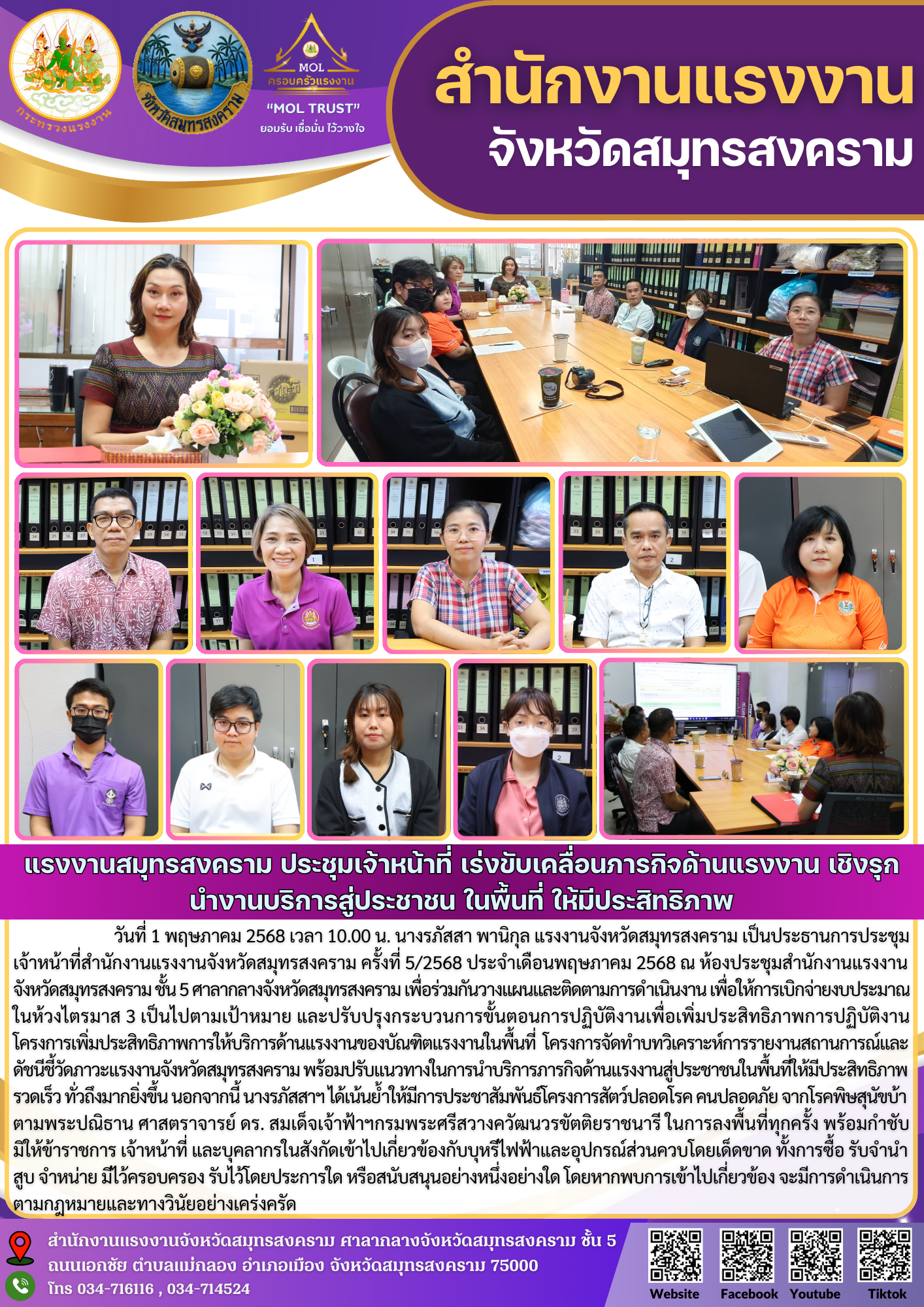 วันที่ 1 พฤษภาคม 2568 เวลา 10.00 น. นางรภัสสา พานิกุล แรงงานจังหวัดสมุทรสงคราม เป็นประธานการประชุมเจ้าหน้าที่สำนักงานแรงงานจังหวัดสมุทรสงคราม ครั้งที่ 5/2568 ประจำเดือนพฤษภาคม 2568 ณ ห้องประชุมสำนักงานแรงงานจังหวัดสมุทรสงคราม ชั้น 5 ศาลากลางจังหวัดสมุทรสงคราม เพื่อร่วมกันวางแผนและติดตามการดำเนินงาน เพื่อให้การเบิกจ่ายงบประมาณในห้วงไตรมาส 3 เป็นไปตามเป้าหมาย และปรับปรุงกระบวนการขั้นตอนการปฏิบัติงานเพื่อเพิ่มประสิทธิภาพการปฏิบัติงาน โครงการเพิ่มประสิทธิภาพการให้บริการด้านแรงงานของบัณฑิตแรงงานในพื้นที่ โครงการจัดทำบทวิเคราะห์การรายงานสถานการณ์ และดัชนีชี้วัดภาวะแรงงานจังหวัดสมุทรสงคราม พร้อมปรับแนวทางในการนำบริการภารกิจด้านแรงงานสู่ประชาชนในพื้นที่ให้มีประสิทธิภาพ รวดเร็ว ทั่วถึงมากยิ่งขึ้น นอกจากนี้ นางรภัสสาฯ ได้เน้นย้ำให้มีการประชาสัมพันธ์โครงการสัตว์ปลอดโรค คนปลอดภัย จากโรคพิษสุนัขบ้า ตามพระปณิธาน ศาสตราจารย์ ดร. สมเด็จเจ้าฟ้าฯกรมพระศรีสวางควัฒนวรขัตติยราชนารี ในการลงพื้นที่ทุกครั้ง พร้อมกำชับ มิให้ข้าราชการ เจ้าหน้าที่ และบุคลากรในสังกัดเข้าไปเกี่ยวข้องกับบุหรีไฟฟ้าและอุปกรณ์ส่วนควบโดยเด็ดขาด ทั้งการซื้อ รับจำนำ สูบ จำหน่าย มีไว้ครอบครอง รับไว้โดยประการใด หรือสนับสนุนอย่างหนึ่งอย่างใด โดยหากพบการเข้าไปเกี่ยวข้อง จะมีการดำเนินการตามกฎหมายและทางวินัยอย่างเคร่งครัด