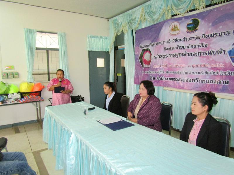 วันที่ 28 มกราคม 2562 เวลา 09.30 น. นางวรรณกานต์ ขาวลาภ แรงงานจังหวัดหนองคาย เป็นประธานเปิดโครงการแก้ไขปัญหาความเดือดร้อนด้านอาชีพจังหวัดหนองคาย ปีงบประมาณ ในกิจกรรมพัฒนาทักษะฝีมือ หลักสูตรการผูกผ้าและการพับผ้า ณ ศาลาประชาคม หมู่ที่ 2 ตำบลหนองปลาปาก อำเภอศรีเชียงใหม่ จังหวัดหนองคาย