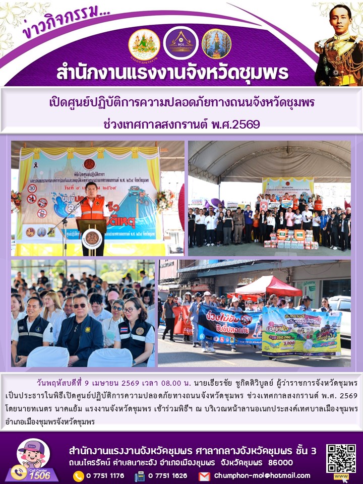 แรงงานจังหวัดชุมพร ร่วมเปิดศูนย์ปฏิบัติการความปลอดภัยทางถนนจังหวัดชุมพร ช่วงเทศกาลสงกรานต์ พ.ศ.2569