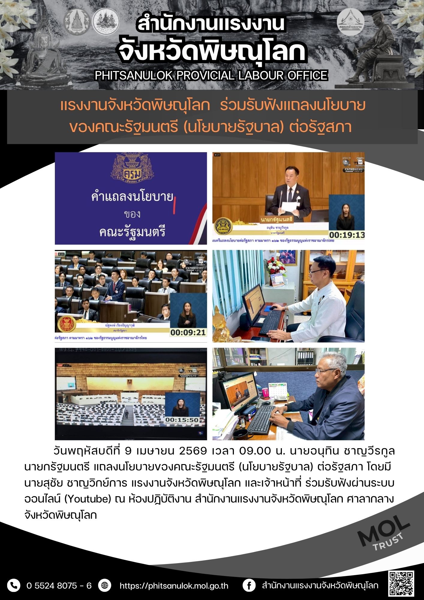 แรงงานจังหวัดพิษณุโลก ร่วมรับฟังแถลงนโยบายของคณะรัฐมนตรี (นโยบายรัฐบาล) ต่อรัฐสภา