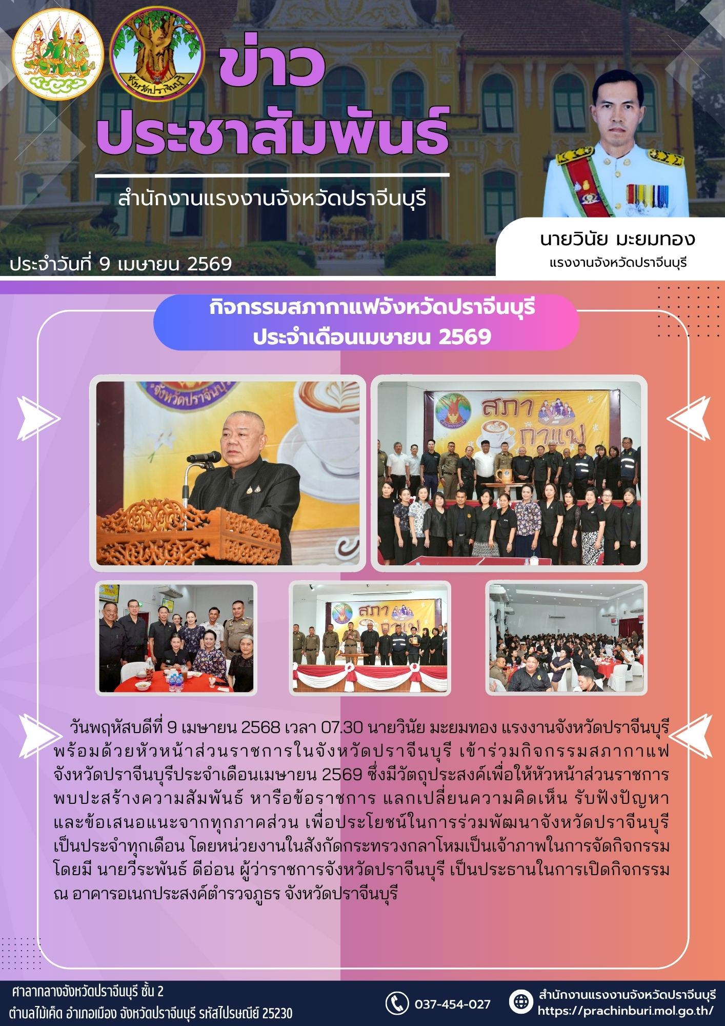 กิจกรรมสภากาแฟจังหวัดปราจีนบุรี ประจำเดือนเมษายน 2569