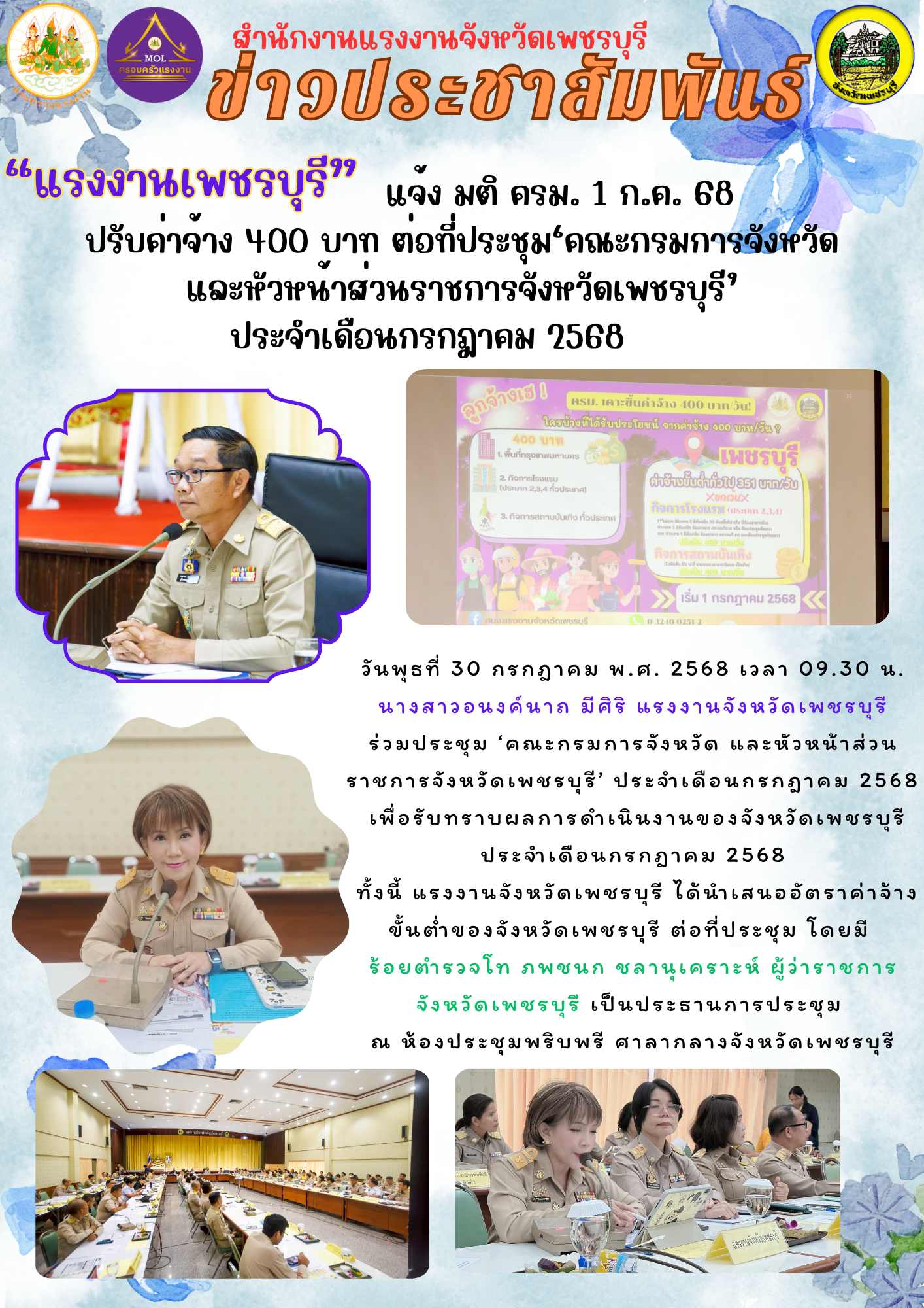 วันพุธที่ 30 กรกฎาคม พ.ศ. 2568 เวลา 09.30 น. นางสาวอนงค์นาถ มีศิริ แรงงานจังหวัดเพชรบุรี ร่วมประชุม ‘คณะกรมการจังหวัด และหัวหน้าส่วนราชการจังหวัดเพชรบุรี’ ประจำเดือนกรกฎาคม 2568 เพื่อรับทราบผลการดำเนินงานของจังหวัดเพชรบุรี ประจำเดือนกรกฎาคม 2568 ทั้งนี้ แรงงานจังหวัดเพชรบุรี ได้นำเสนออัตราค่าจ้างขั้นต่ำของจังหวัดเพชรบุรี ต่อที่ประชุม โดยมี ร้อยตำรวจโท ภพชนก ชลานุเคราะห์ ผู้ว่าราชการจังหวัดเพชรบุรี เป็นประธานการประชุม ณ ห้องประชุมพริบพรี ศาลากลางจังหวัดเพชรบุรีเพชรบุรี
