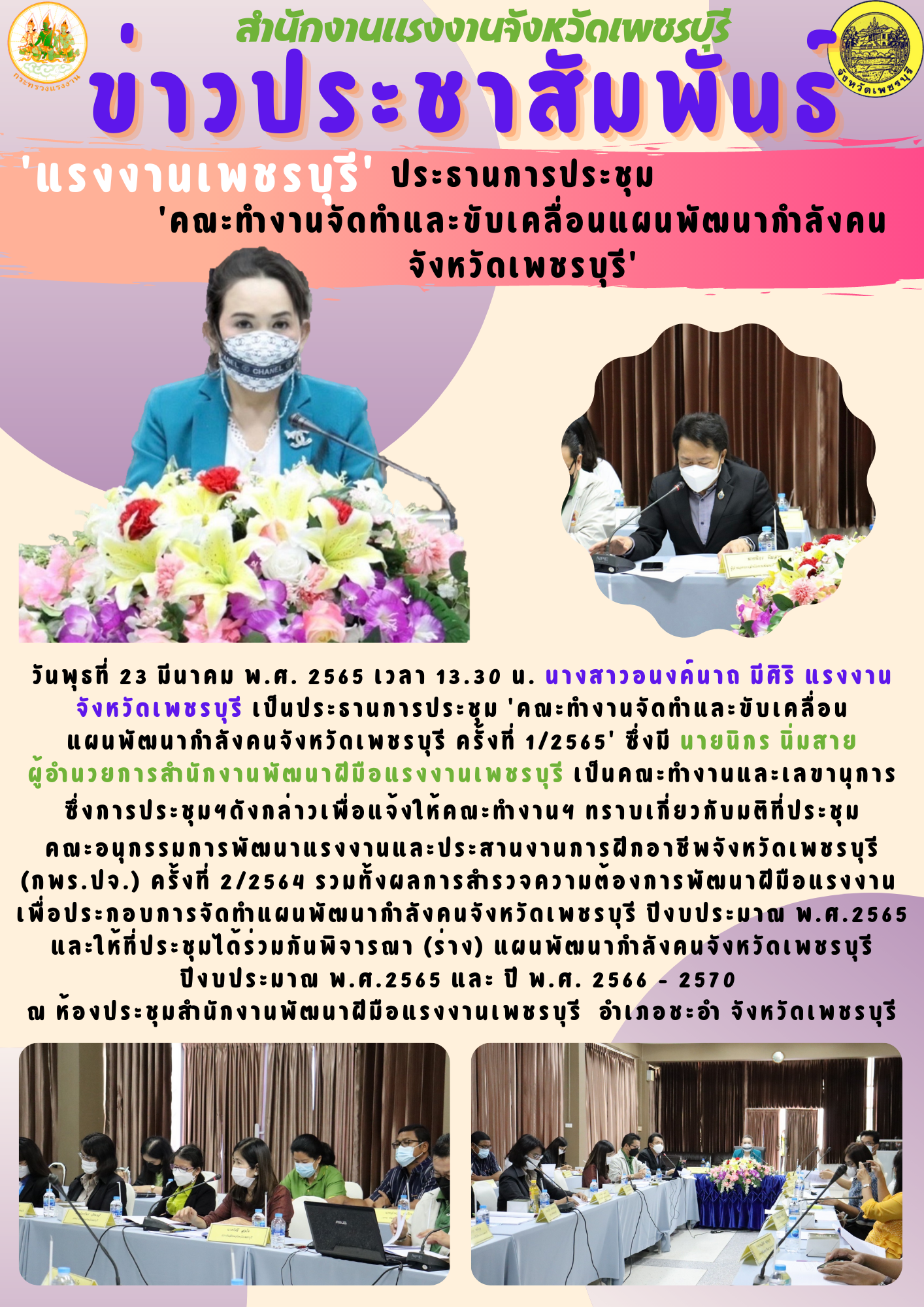 วันพุธที่ 23 มีนาคม พ.ศ. 2565 เวลา 13.30 น. นางสาวอนงค์นาถ มีศิริ แรงงานจังหวัดเพชรบุรี เป็นประธานการประชุม ‘คณะทำงานจัดทำและขับเคลื่อนแผนพัฒนากำลังคนจังหวัดเพชรบุรี ครั้งที่ 1/2565’ ซึ่งมี นายนิกร นิ่มสาย ผู้อำนวยการสำนักงานพัฒนาฝีมือแรงงานเพชรบุรี เป็นคณะทำงานและเลขานุการ ซึ่งการประชุมฯดังกล่าวเพื่อแจ้งให้คณะทำงานฯ ทราบเกี่ยวกับมติที่ประชุมคณะอนุกรรมการพัฒนาแรงงานและประสานงานการฝีกอาชีพจังหวัดเพชรบุรี (กพร.ปจ.) ครั้งที่ 2/2564 รวมทั้งผลการสำรวจความต้องการพัฒนาฝีมือแรงงาน เพื่อประกอบการจัดทำแผนพัฒนากำลังคนจังหวัดเพชรบุรี ปีงบประมาณ พ.ศ.2565 และให้ที่ประชุมได้ร่วมกันพิจารณา (ร่าง) แผนพัฒนากำลังคนจังหวัดเพชรบุรี ปีงบประมาณ พ.ศ.2565 และ ปี พ.ศ. 2566 – 2570 ณ ห้องประชุมสำนักงานพัฒนาฝีมือแรงงานเพชรบุรี อำเภอชะอำ จังหวัดเพชรบุรี