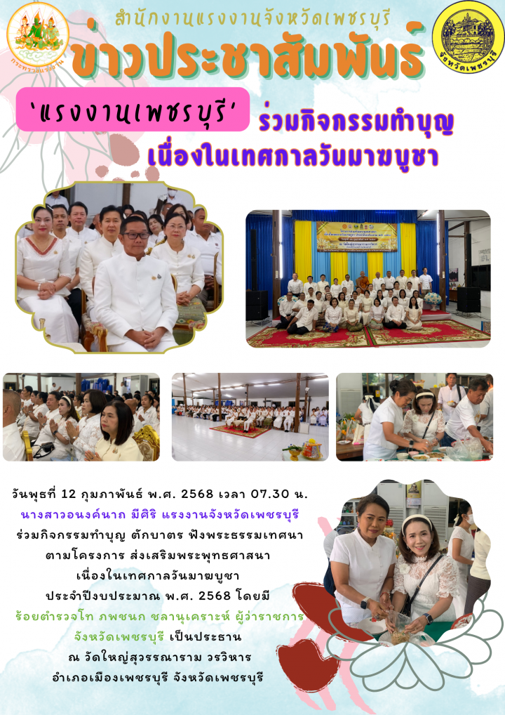 วันพุธที่ 12 กุมภาพันธ์ พ.ศ. 2568 เวลา ๐7.30 น. นางสาวอนงค์นาถ มีศิ แรงงานจังหวัดเพชรบุรี ร่วมกิจกรรมทำบุญ ตักบาตร ฟังพระธรรมเทศนา ตามโครงการ ส่งเสริมพระพุทธศาสนา เนื่องในเทศกาลวันมาฆบูชา ประจำปีงบประมาณ พ.ศ. 2568 โดยมี ร้อยตำรวจโท ภพชนก ชลานุเคราะห์ ผู้ว่าราชการจังหวัดเพชรบุรี เป็นประธาน ณ วัดใหญ่สุวรรณาราม วรวิหารอำเภอเมืองเพชรบุรี จังหวัดเพชรบุรี