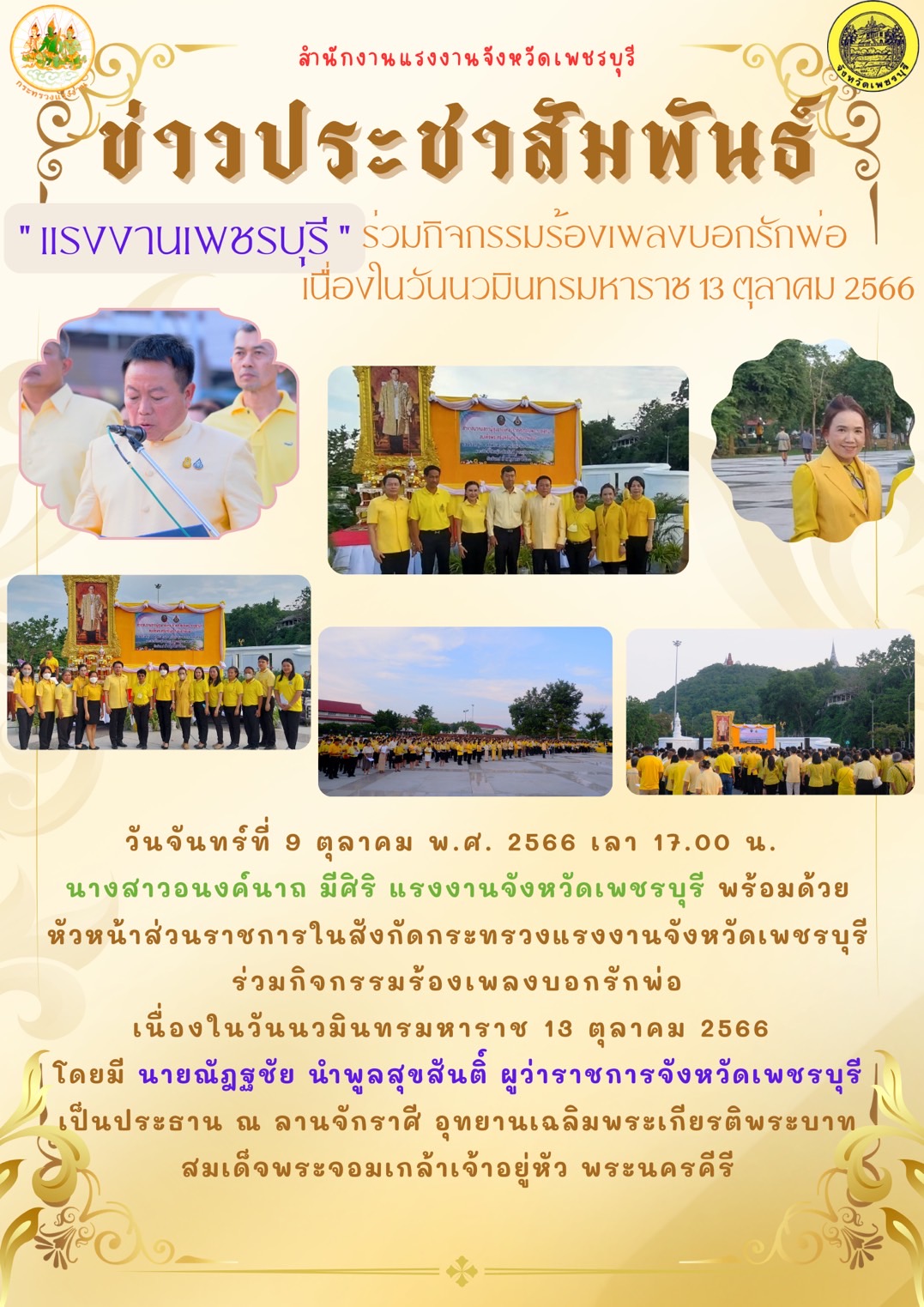 วันจันทร์ที่ 9 ตุลาคม พ.ศ. 2566 เลา 17.00 น. นางสาวอนงค์นาถ มีศิริ แรงงานจังหวัดเพชรบุรี ร่วมกิจกรรมร้องเพลงบอกรักพ่อ เนื่องในวันนวมินทรมหาราช 13 ตุลาคม 2566 โดยมี นายณัฎฐชัย นำพูลสุขสันติ์ ผูว่าราชการจังหวัดเพชรบุรี เป็นประธาน ณ ลานจักราศี อุทยานเฉลิมพระเกียรติพระบาทสมเด็จพระจอมเกล้าเจ้าอยู่หัว พระนครคีรี