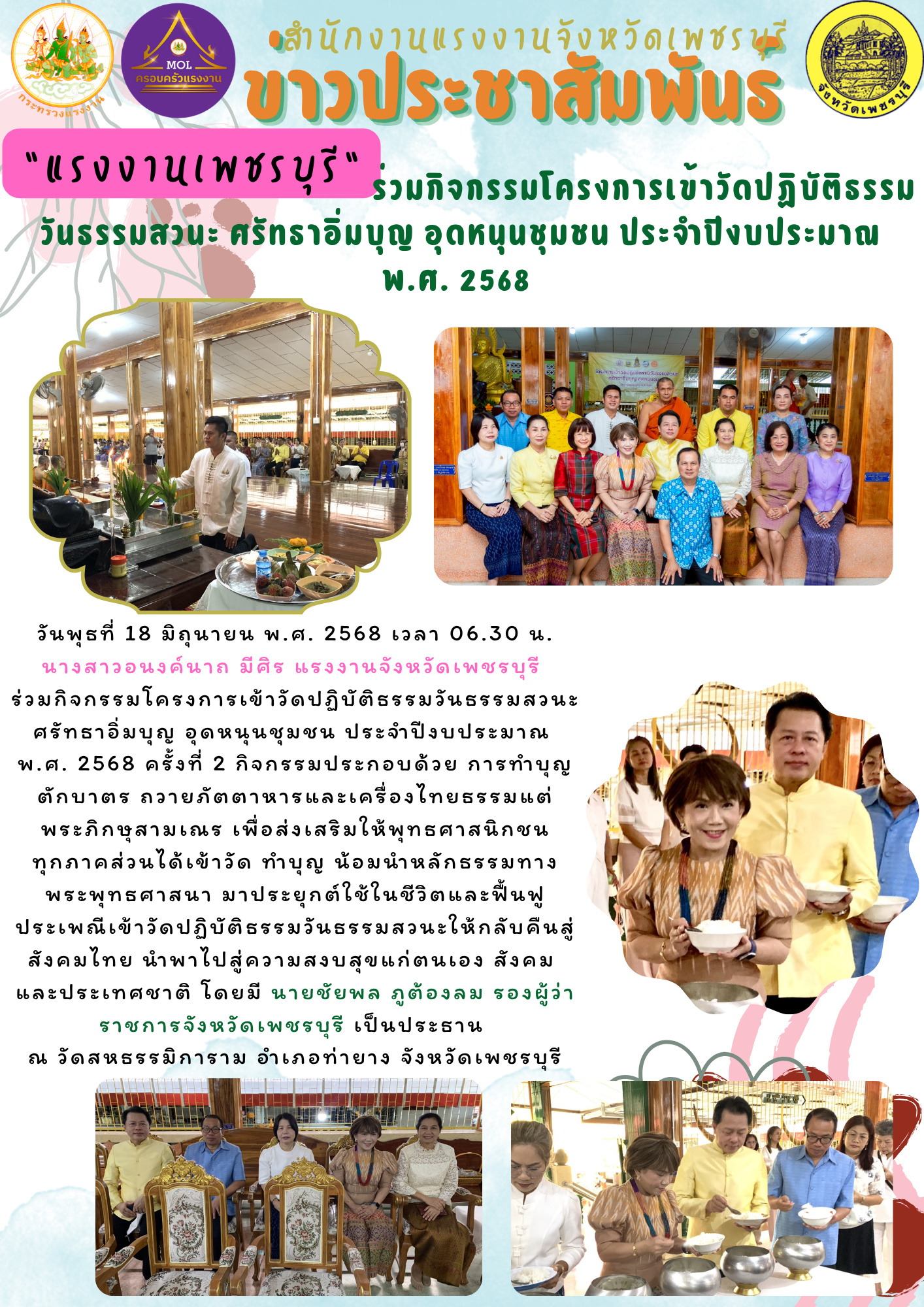 วันพุธที่ 18 มิถุนายน พ.ศ. 2568 เวลา 06.30 น. นางสาวอนงค์นาถ มีศิร แรงงานจังหวัดเพชรบุรี ร่วมกิจกรรมโครงการเข้าวัดปฏิบัติธรรมวันธรรมสวนะ ศรัทธาอิ่มบุญ อุดหนุนชุมชน ประจำปีงบประมาณ พ.ศ. 2568 ครั้งที่ 2 กิจกรรมประกอบด้วย การทำบุญตักบาตร ถวายภัตตาหารและเครื่องไทยธรรมแต่พระภิกษุสามเณร เพื่อส่งเสริมให้พุทธศาสนิกชนทุกภาคส่วนได้เข้าวัด ทำบุญ น้อมนำหลักธรรมทางพระพุทธศาสนา มาประยุกต์ใช้ในชีวิตและฟื้นฟูประเพณีเข้าวัดปฏิบัติธรรมวันธรรมสวนะให้กลับคืนสู่สังคมไทย นำพาไปสู่ความสงบสุขแก่ตนเอง สังคม และประเทศชาติ โดยมี นายชัยพล ภูต้องลม รองผู้ว่าราชการจังหวัดเพชรบุรี เป็นประธาน ณ วัดสหธรรมิการาม อำเภอท่ายาง จังหวัดเพชรบุรี