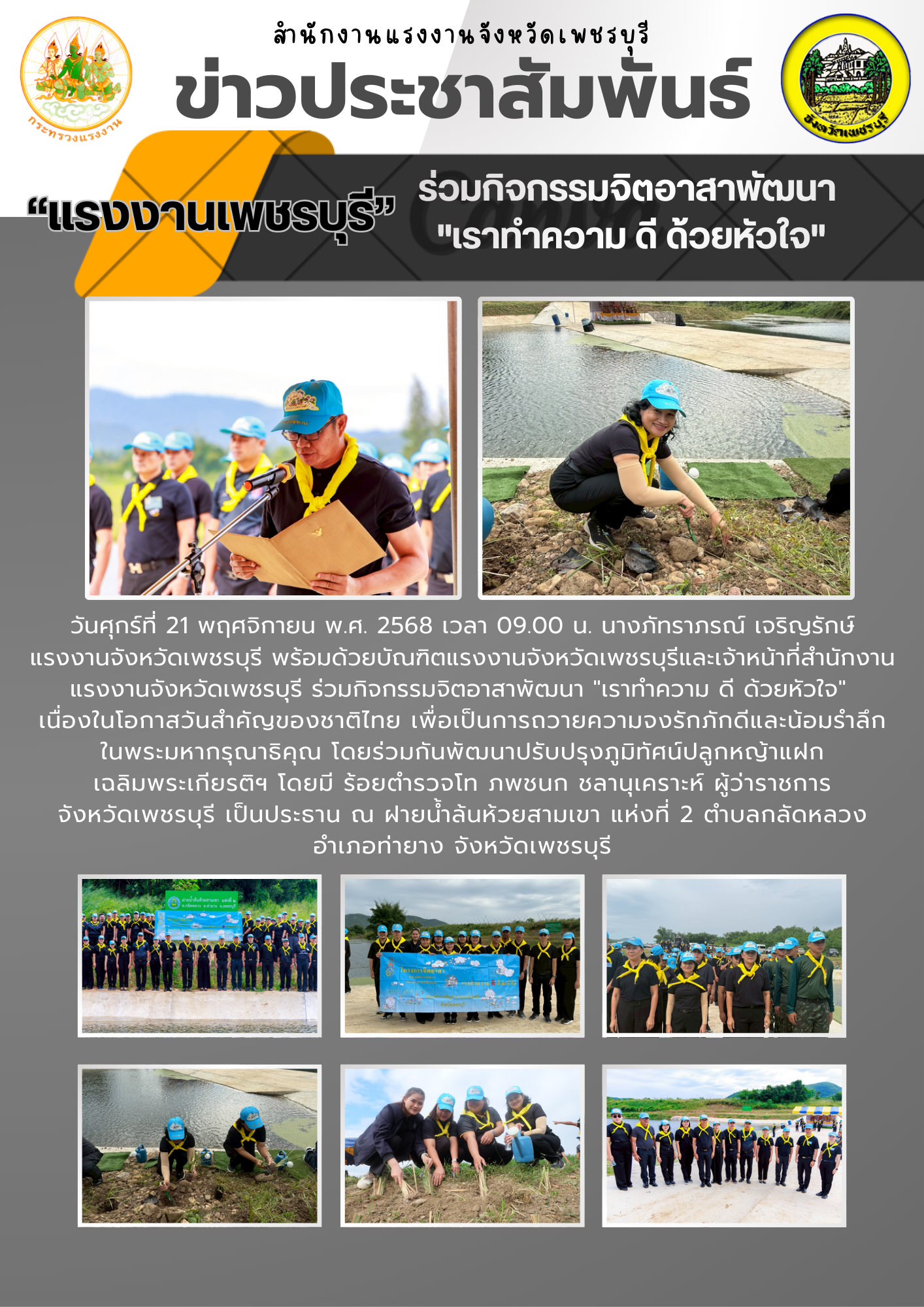 วันศุกร์ที่ 21 พฤศจิกายน พ.ศ. 2568 เวลา 09.00 น. นางภัทราภรณ์ เจริญรักษ์ แรงงานจังหวัดเพชรบุรี พร้อมด้วยบัณฑิตแรงงานจังหวัดเพชรบุรีและเจ้าหน้าที่สำนักงานแรงงานจังหวัดเพชรบุรี ร่วมกิจกรรมจิตอาสาพัฒนา “เราทำความ ดี ด้วยหัวใจ” เนื่องในโอกาสวันสำคัญของชาติไทย เพื่อเป็นการถวายความจงรักภักดีและน้อมรำลึกในพระมหากรุณาธิคุณ โดยร่วมกันพัฒนาปรับปรุงภูมิทัศน์ปลูกหญ้าแฝกเฉลิมพระเกียรติฯ โดยมี ร้อยตำรวจโท ภพชนก ชลานุเคราะห์ ผู้ว่าราชการจังหวัดเพชรบุรี เป็นประธาน ณ ฝายน้ำล้นห้วยสามเขา แห่งที่ 2 ตำบลกลัดหลวง อำเภอท่ายาง จังหวัดเพชรบุรี
