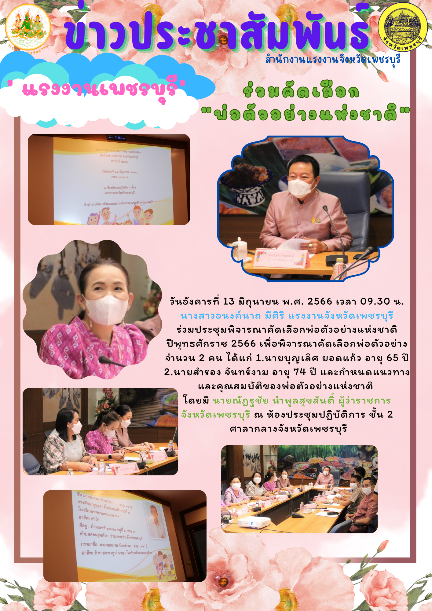 วันอังคารที่ 13 มิถุนายน พ.ศ. 2566 เวลา 09.30 น.นางสาวอนงค์นาถ มีศิริ แรงงานจังหวัดเพชรบุรี ร่วมประชุมพิจารณาคัดเลือกพ่อตัวอย่างแห่งชาติ ปีพุทธศักราช 2566 เพื่อพิจารณาคัดเลือกพ่อตัวอย่าง จำนวน 2 คน ได้แก่ 1.นายบุญเลิศ ยอดแก้ว อายุ 65 ปี 2.นายสำรอง จันทร์งาม อายุ 74 ปี และกำหนดแนวทางและคุณสมบัติของพ่อตัวอย่างแห่งชาติ โดยมี นายณัฏฐชัย นำพูลสุขสันติ์ ผู้ว่าราชการจังหวัดเพชรบุรี ณ ห้องประชุมปฏิบัติการ ชั้น 2 ศาลากลางจังหวัดเพชรบุรี