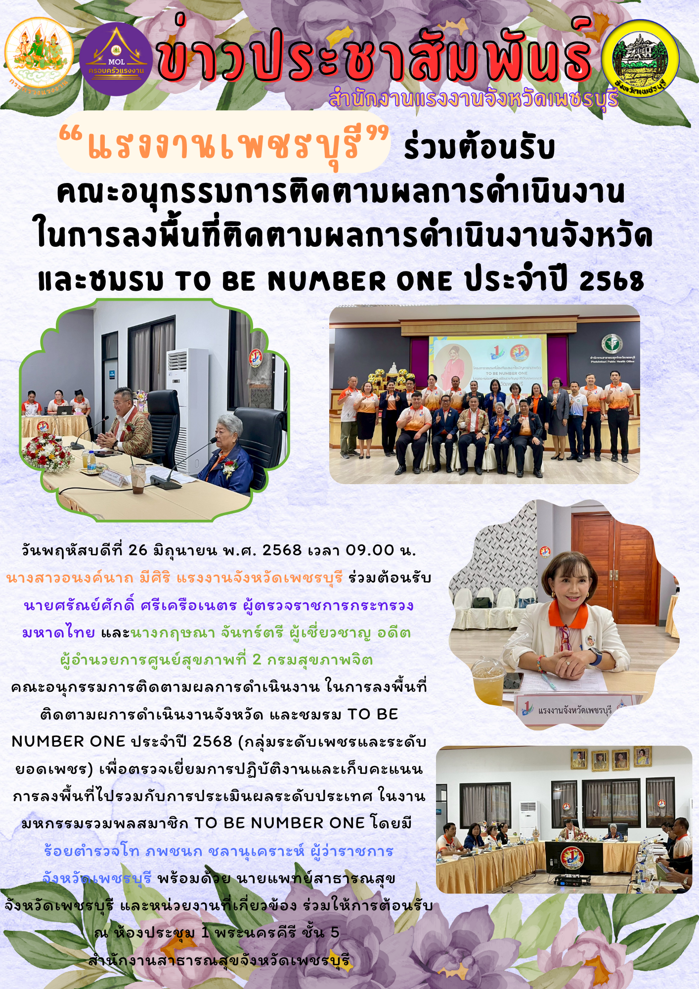 วันพฤหัสบดีที่ 26 มิถุนายน พ.ศ. 2568 เวลา 09.00 น. นางสาวอนงค์นาถ มีศิริ แรงงานจังหวัดเพชรบุรี ร่วมต้อนรับ นายศรัณย์ศักดิ์ ศรีเครือเนตร ผู้ตรวจราชการกระทรวงมหหาดไทย และนางกฤษณา จันทร์ตรี ผู้เชี่ยวชาญ อดีต ผู้อำนวยการศูนย์สุขภาพที่ 2 กรมสุขภาะจิต คณะอนุกรรมการติดตามผลการดำเนินงาน ในการลงพื้นที่ติดตามผการดำเนินงานจังหวัด และชมรม TO BE NUMBER ONE ประจำปี 2568 (กลุ่มระดับเพชรและระดับยอดเพชร) เพื่อตรวจเยี่ยมการปฏิบัติงานและเก็บคะแนนการลงพื้นที่ไปรวมกับการประเมินผลระดับประเทศ ในงานมหกรรมรวมพลสมาชิก TO BE NUMBER ONE โดยมี ร้อยตำรวจโท ภพชนก ชลานุเคราะห์ ผู้ว่าราชการจังหวัดเพชรบุรี พร้อมด้วย นายแพทย์สาธารณสุขจังหวัดเพชรบุรี และหน่วยงานที่เกี่ยวข้อง ร่วมให้การต้อนรับ ณ ห้องประชุม 1 พระนครคีรี ชั้น 5 สำนักงานสาธารณสุขจังหวัดเพชรบุรี
