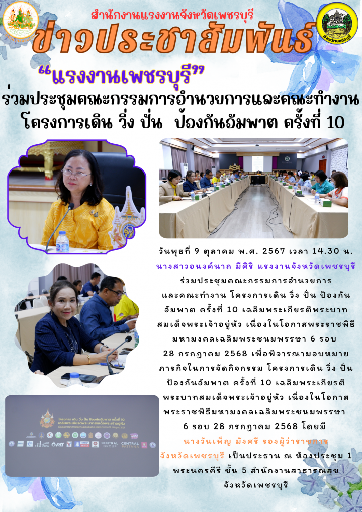 วันพุธที่ 9 ตุลาคม พ.ศ. 2567 เวลา 14.30 น. นางสาวอนงค์นาถ มีศิริ แรงงานจังหวัดเพชรบุรี ร่วมประชุมคณะกรรมการอำนวยการและคณะทำงาน โครงการเดิน วิ่ง ปั่น ป้องกันอัมพาต ครั้งที่ 10 เฉลิมพระเกียรติพระบาทสมเด็จพระเจ้าอยู่หัว เนื่องในโอกาสพระราชพิธีมหามงคลเฉลิมพระชนมพรรษา 6 รอบ 28 กรกฎาคม 2568 เพื่อพิจารณามอบหมายภารกิจในการจัดกิจกรรม โครงการเดิน วิ่ง ปั่น ป้องกันอัมพาต ครั้งที่ 10 เฉลิมพระเกียรติพระบาทสมเด็จพระเจ้าอยู่หัว เนื่องในโอกาสพระราชพิธีมหามงคลเฉลิมพระชนมพรรษา 6 รอบ 28 กรกฎาคม 2568 โดยมี นางวันเพ็ญ มังศรี รองผู้ว่าราชการจังหวัดเพชรบุรี เป็นประธาน ณ ห้องประชุม 1 พระนครคีรี ชั้น 5 สำนักงานสาธารณสุขจังหวัดเพชรบุรี