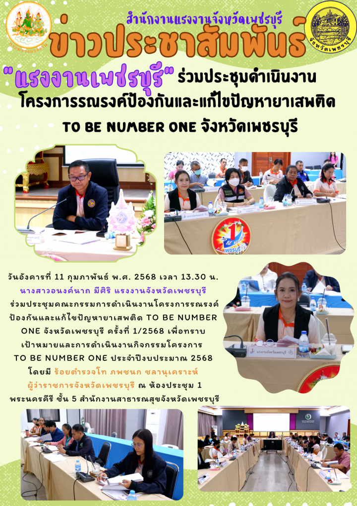 วันอังคารที่ 11 กุมภาพันธ์ พ.ศ. 2568 เวล้ 13.30 น. นางสาวอนงค์นาถ มีศิริ แรงงานจังหวัดเพชรบุรี ร่วมประชุมคณะกรรมการดำเนินงานโครงการรณรงค์ป้องกันและแก้ไขปัญหายาเสพติด TO BE NUMBER ONE จังหวัดเพชรบุรี ครั้งที่ 1/2568 เพื่อทราบเป้าหมายและการดำเนินงานกิจกรรมโครงการ TO BE NUMBER ONE ประจำปีงบประมาณ 2568 โดยมี ร้อยตำรวจโท ภพชนก ชลานุเคราะห์ ผู้ว่าราชการจังหวัดเพชรบุรี ณ ห้องประชุม 1 พระนครคีรี ชั้น 5 สำนักงานสาธารณสุขจังหวัดเพชรบุรี