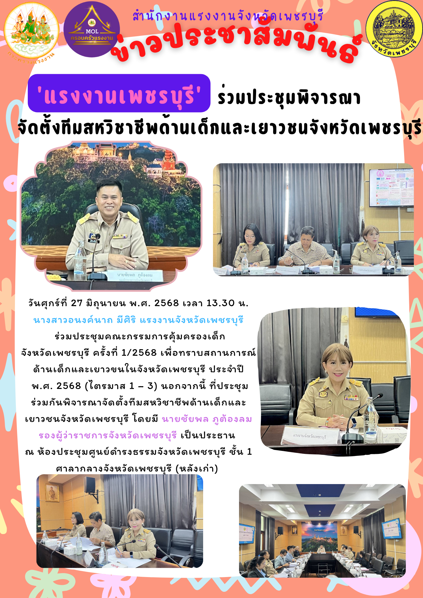วันศุกร์ที่ 27 มิถุนายน พ.ศ. 2568 เวลา 13.30 น. นางสาวอนงค์นาถ มีศิริ แรงงานจังหวัดเพชรบุรี ร่วมประชุมคณะกรรมการคุ้มครองเด็กจังหวัดเพชรบุรี ครั้งที่ 1/2568 เพื่อทราบสถานการณ์ด้านเด็กและเยาวขนในจังหวัดเพชรบุรี ประจำปี พ.ศ. 2568 (ไตรมาส 1 – 3) นอกจากนี้ที่ประชุมร่วมกันพิจารณาจัดตั้งทีมสหวิชาชีพด้านเด็กและเยาวชนจังหวัดเพชรบุรี โดยมี นายชัยพล ภูต้องลม รองผู้ว่าราชการจังหวัดเพชรบุรี เป็นประธาน ณ ห้องประชุมศูนย์ดำรงธรรมจังหวัดเพชรบุรี ชั้น 1 ศาลากลางจังหวัดเพชรบุรี (หลังเก่า)