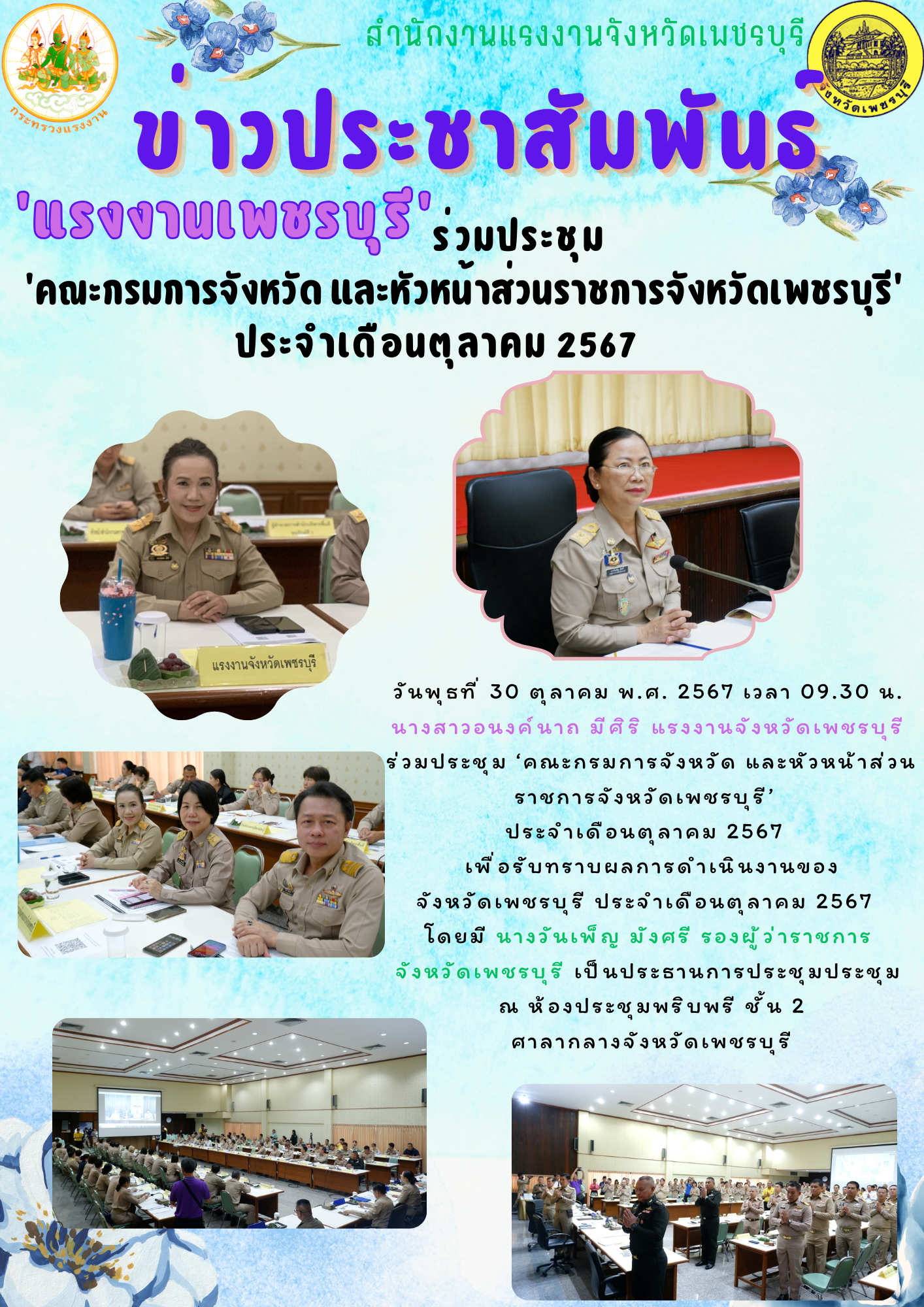 วันพุธที่ 30 ตุลาคม พ.ศ. 2567 เวลา 09.30 น. นางสาวอนงค์นาถ มีศิริ แรงงานจังหวัดเพชรบุรี ร่วมประชุม ‘คณะกรมการจังหวัด และหัวหน้าส่วนราชการจังหวัดเพชรบุรี’ ประจำเดือนตุลาคม 2567 เพื่อรับทราบผลการดำเนินงานของจังหวัดเพชรบุรี ประจำเดือนตุลาคม 2567 โดยมี นางวันเพ็ญ มังศรี รองผู้ว่าราชการจังหวัดเพชรบุรี เป็นประธานการประชุมประชุม ณ ห้องประชุมพริบพรี ชั้น 2 ศาลากลางจังหวัดเพชรบุรี