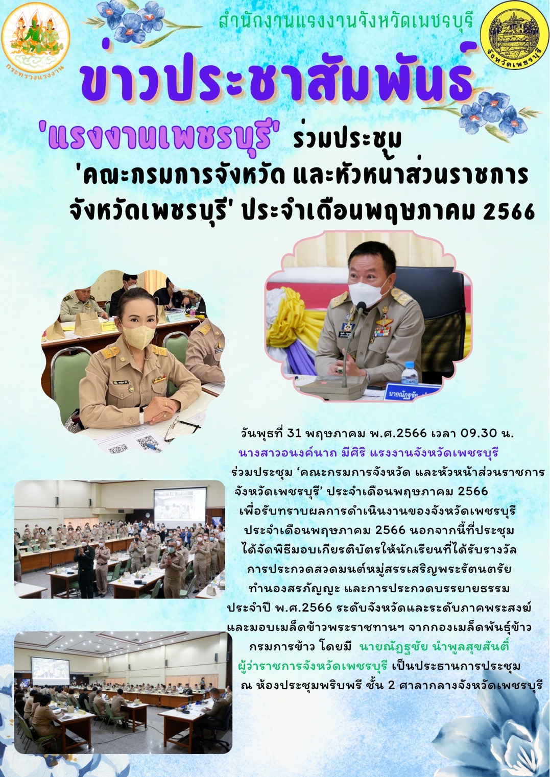 วันพุธที่ 31 พฤษภาคม พ.ศ.2566 เวลา 09.30 น. นางสาวอนงค์นาถ มีศิริ แรงงานจังหวัดเพชรบุรี ร่วมประชุม ‘คณะกรมการจังหวัด และหัวหน้าส่วนราชการจังหวัดเพชรบุรี’ ประจำเดือนพฤษภาคม 2566 เพื่อรับทราบผลการดำเนินงานของจังหวัดเพชรบุรี ประจำเดือนพฤษภาคม 2566 นอกจากนี้ที่ประชุมได้จัดพิธีมอบเกียรติบัตรให้นักเรียนที่ได้รับรางวัลการประกวดสวดมนต์หมู่สรรเสริญพระรัตนตรัยทำนองสรภัญญะ และการประกวดบรรยายธรรม ประจำปี พ.ศ.2566 ระดับจังหวัดและระดับภาคพระสงฆ์ และมอบเมล็ดข้าวพระราชทานฯ จากกองเมล็ดพันธุ์ข้าว กรมการข้าว โดยมี นายณัฏฐชัย นำพูลสุขสันติ์ ผู้ว่าราชการจังหวัดเพชรบุรี เป็นประธานการประชุมประชุม ณ ห้องประชุมแก้วเจ้าจอม วิทยาลัยพยาบาลพระจอมเกล้าจังหวัดเพชรบุรี