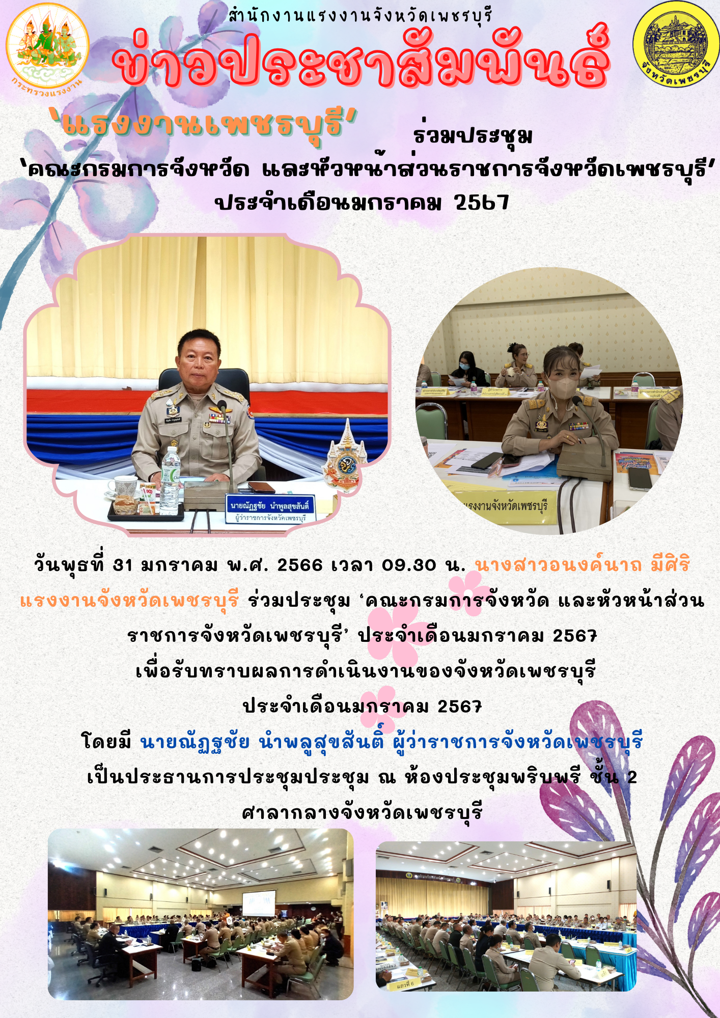 วันพุธที่ 31 มกราคม พ.ศ. 2566 เวลา 09.30 น. นางสาวอนงค์นาถ มีศิริ แรงงานจังหวัดเพชรบุรี ร่วมประชุม ‘คณะกรมการจังหวัด และหัวหน้าส่วนราชการจังหวัดเพชรบุรี’ ประจำเดือนมกราคม 2567 เพื่อรับทราบผลการดำเนินงานของจังหวัดเพชรบุรี ประจำเดือนมกราคม 2567 โดยมี นายณัฏฐชัย นำพลูสุขสันติ์ ผู้ว่าราชการจังหวัดเพชรบุรี เป็นประธานการประชุมประชุม ณ ห้องประชุมพริบพรี ชั้น 2 ศาลากลางจังหวัดเพชรบุรี