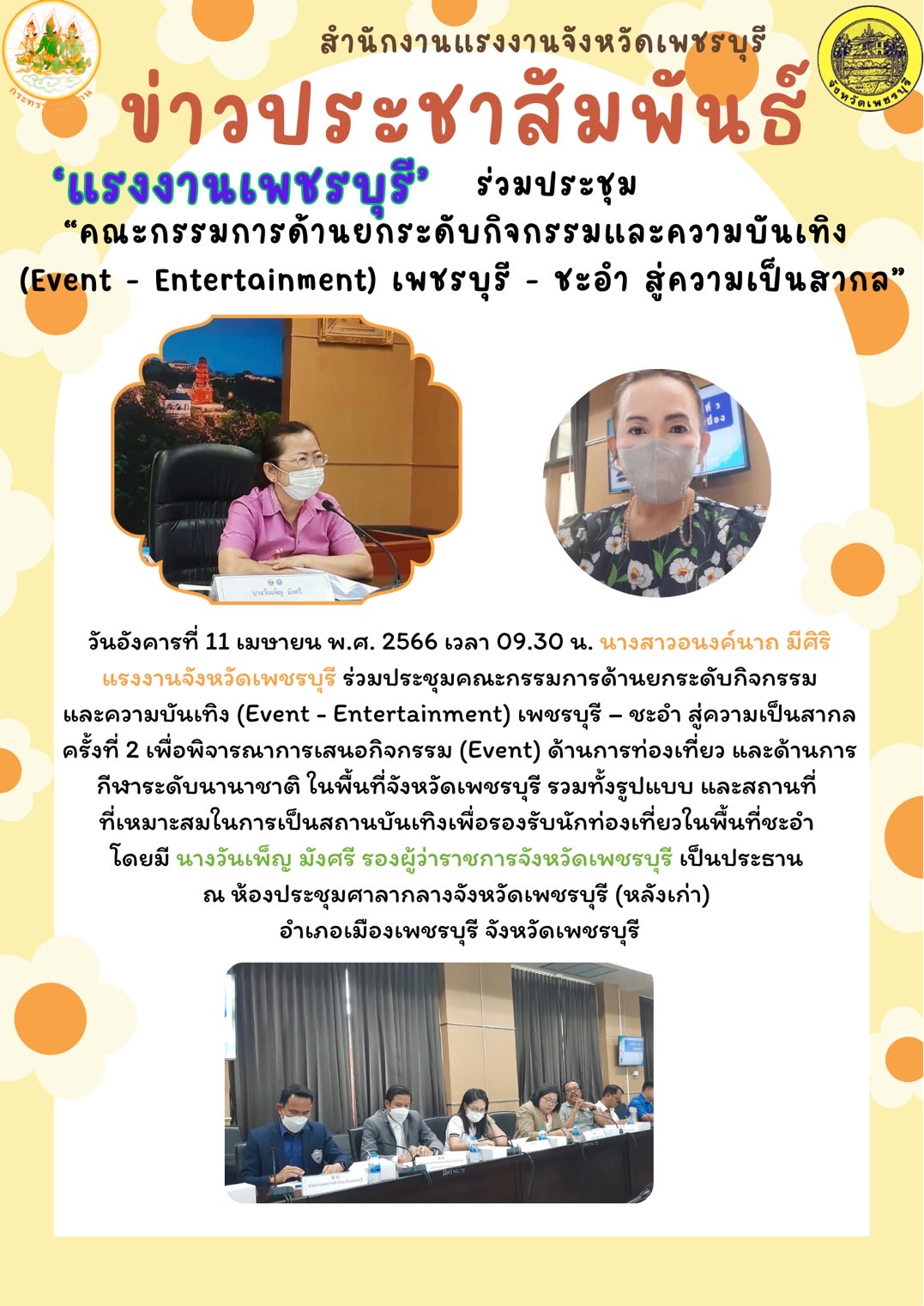 วันอังคารที่ 11 เมษายน พ.ศ. 2566 เวลา 09.30 น. นางสาวอนงค์นาถ มีศิริ แรงงานจังหวัดเพชรบุรี ร่วมประชุมคณะกรรมการด้านยกระดับกิจกรรมและความบันเทิง (Event – Entertainment) เพชรบุรี – ชะอำ สู่ความเป็นสากล ครั้งที่ 2 เพื่อพิจารณาการเสนอกิจกรรม (Event) ด้านการท่องเที่ยว และด้านการกีฬาระดับนานาชาติ ในพื้นที่จังหวัดเพชรบุรี รวมทั้งรูปแบบ และสถานที่ ที่เหมาะสมในการเป็นสถานบันเทิงเพื่อรองรับนักท่องเที่ยวในพื้นที่ชะอำ โดยมี นางวันเพ็ญ มังศรี รองผู้ว่าราชการจังหวัดเพชรบุรี เป็นประธาน ณ ห้องประชุมศาลากลางจังหวัดเพชรบุรี (หลังเก่า) อำเภอเมืองเพชรบุรี จังหวัดเพชรบุรี