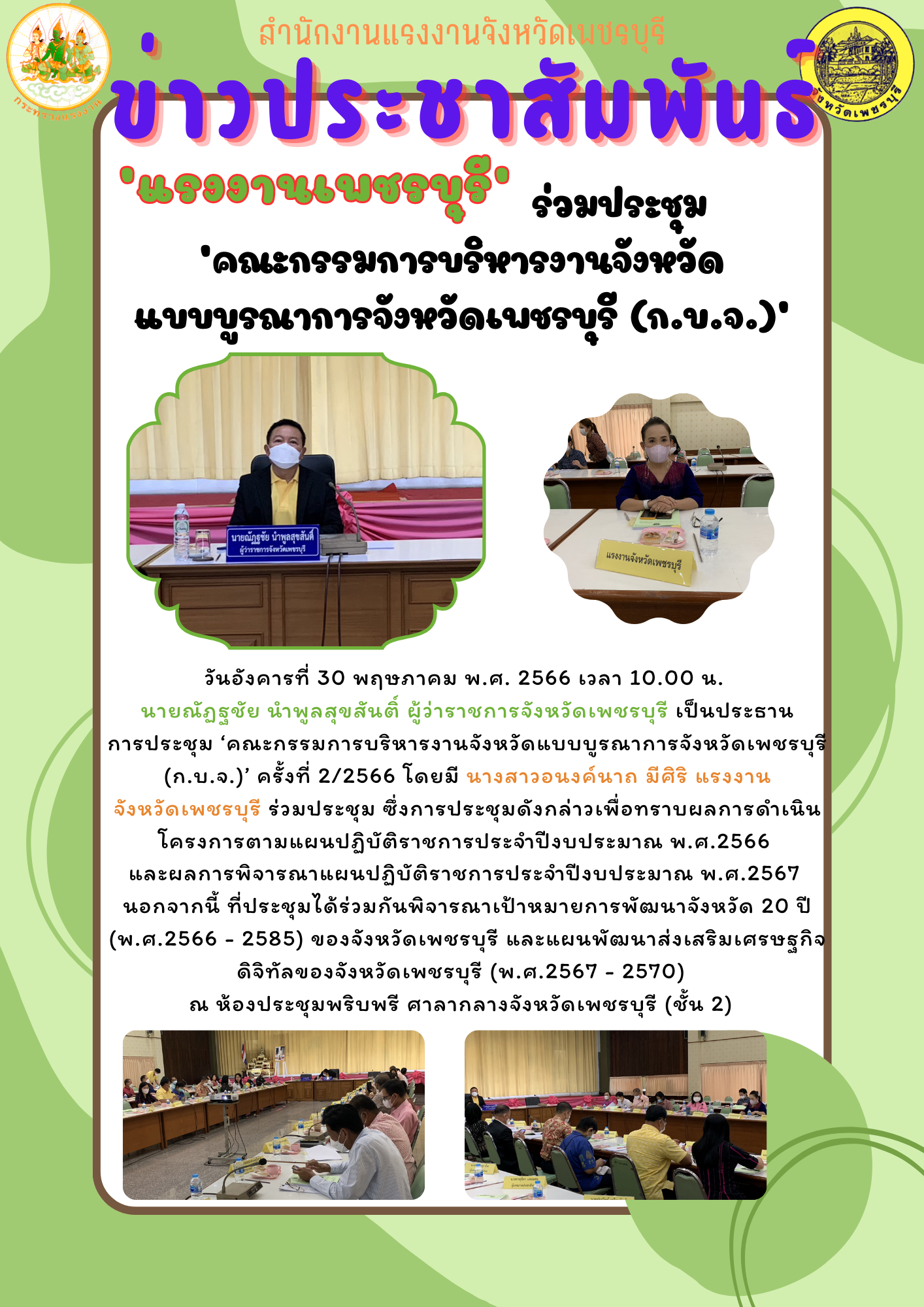วันอังคารที่ 30 พฤษภาคม พ.ศ. 2566 เวลา 10.00 น. นายฏฐชัย นำพูลสุขสันติ์ ผู้ว่าราชการจังหวัดเพชรบุรี เป็นประธานการประชุม ‘คณะกรรมการบริหารงานจังหวัดแบบบูรณาการจังหวัดเพชรบุรี (ก.บ.จ.)’ ครั้งที่ 2/2566 โดยมี นางสาวอนงค์นาถ มีศิริ แรงงานจังหวัดเพชรบุรี ร่วมประชุม ซึ่งการประชุมดังกล่าวเพื่อทราบผลการดำเนินโครงการตามแผนปฏิบัติราชการประจำปีงบประมาณ พ.ศ.2566 และผลการพิจารณาแผนปฏิบัติราชการประจำปีงบประมาณ พ.ศ.2567 ณ ห้องประชุมพริบพรี ศาลากลางจังหวัดเพชรบุรี (ชั้น 2)