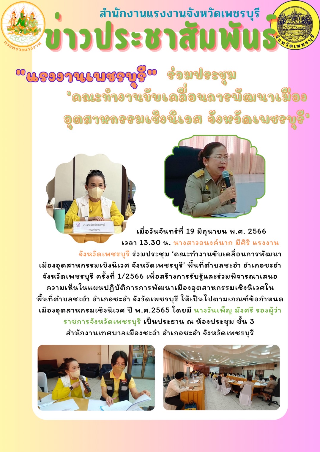 วันจันทร์ที่ 19 มิถุนายน พ.ศ. 2566 เวลา 13.30 น. นางสาวอนงค์นาถ มีศิริ แรงงานจังหวัดเพชรบุรี ร่วมประชุม ‘คณะทำงานขับเคลื่อนการพัฒนาเมืองอุตสาหกรรมเชิงนิเวศ จังหวัดเพชรบุรี’ พื้นที่ตำบลชะอำ อำเภอชะอำ จังหวัดเพชรบุรี ครั้งที่ 1/2566 เพื่อสร้างการรับรู้และร่วมพิจารณาเสนอความเห็นในแผนปฏิบัติการการพัฒนาเมืองอุตสาหกรรมเชิงนิเวศในพื้นที่ตำบลชะอำ อำเภอชะอำ จังวัดเพชรบุรี ให้เป็นไปตามเกณฑ์ข้อกำหนดเมืองอุตสาหกรมเชิงนิเวศ ปี พ.ศ.2565 โดยมี นางวันเพ็ญ มังศรี รองผู้ว่าราชการจังหวัดเพชรบุรี เป็นประธาน ณ ห้องประชุม ชั้น 3 สำนักงานเทศบาลเมืองชะอำ อำเภอชะอำ จังหวัดเพชรบุรี
