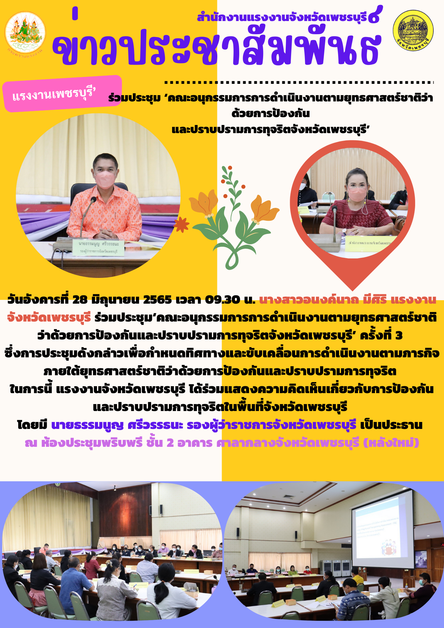 วันอังคารที่ 28 มิถุนายน 2565 เวลา 09.30 น. นางสาวอนงค์นาถ มีศิริ แรงงานจังหวัดเพชรบุรี ร่วมประชุม‘คณะอนุกรรมการการดำเนินงานตามยุทธศาสตร์ชาติว่าด้วยการป้องกันและปราบปรามการทุจริตจังหวัดเพชรบุรี’ ครั้งที่ 3 ซึ่งการประชุมดังกล่าวเพื่อกำหนดทิศทางและขับเคลื่อนการดำเนินงานตามภารกิจภายใต้ยุทธศาสตร์ชาติว่าด้วยการป้องกันและปราบปรามการทุจริต ในการนี้ แรงงานจังหวัดเพชรบุรี ได้ร่วมแสดงความคิดเห็นเกี่ยวกับการป้องกันและปราบปรามการทุจริตในพื้นที่จังหวัดเพชรบุรี โดยมี นายธรรมนูญ ศรีวรรธนะ รองผู้ว่าราชการจังหวัดเพชรบุรี เป็นประธาน ณ ห้องประชุมพริบพรี ชั้น ๒ อาคาร ศาลากลางจังหวัดเพชรบุรี (หลังใหม่)