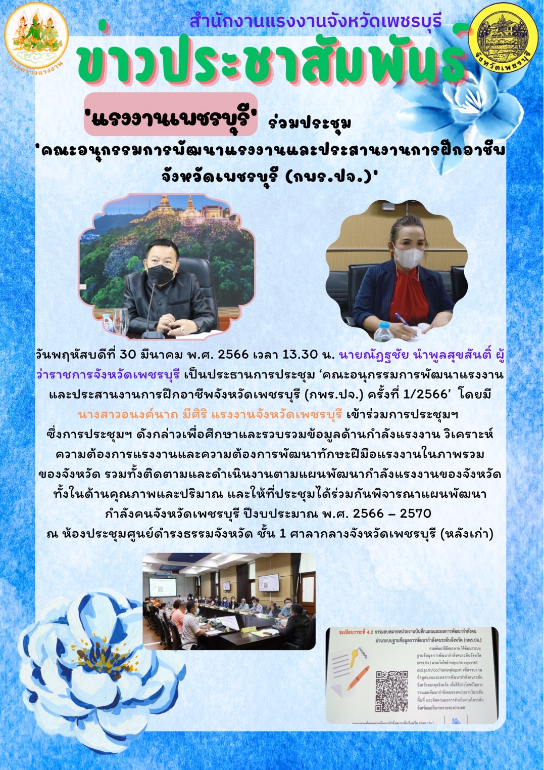 วันพฤหัสบดีที่ 30 มีนาคม พ.ศ. 2566 เวลา 13.30 น. นายณัฏฐชัย นำพูลสุขสันติ์ ผู้ว่าราชการจังหวัดเพชรบุรี เป็นประธานการประชุม ‘คณะอนุกรรมการพัฒนาแรงงานและประสานงานการฝีกอาชีพจังหวัดเพชรบุรี (กพร.ปจ.) ครั้งที่ 1/2566’ โดยมี นางสาวอนงค์นาถ มีศิริ แรงงานจังหวัดเพชรบุรี เข้าร่วมการประชุมฯ ซึ่งการประชุมฯดังกล่าวเพื่อศึกษาและรวบรวมข้อมูลด้านกำลังแรงงาน วิเคราะห์ความต้องการแรงงานและความต้องการพัฒนาทักษะฝีมือแรงงานในภาพรวมของจังหวัด รวมทั้งติดตามและดำเนินงานตามแผนพัฒนากำลังแรงงานของจังหวัดทั้งในด้านคุณภาพและปริมาณ และให้ที่ประชุมได้ร่วมกันพิจารณาแผนพัฒนากำลังคนจังหวัดเพชรบุรี ปีงบประมาณ พ.ศ. 2566 – 2570 ณ ห้องประชุมศูนย์ดำรงธรรมจังหวัด ชั้น 1 ศาลากลางจังหวัดเพชรบุรี (หลังเก่า)