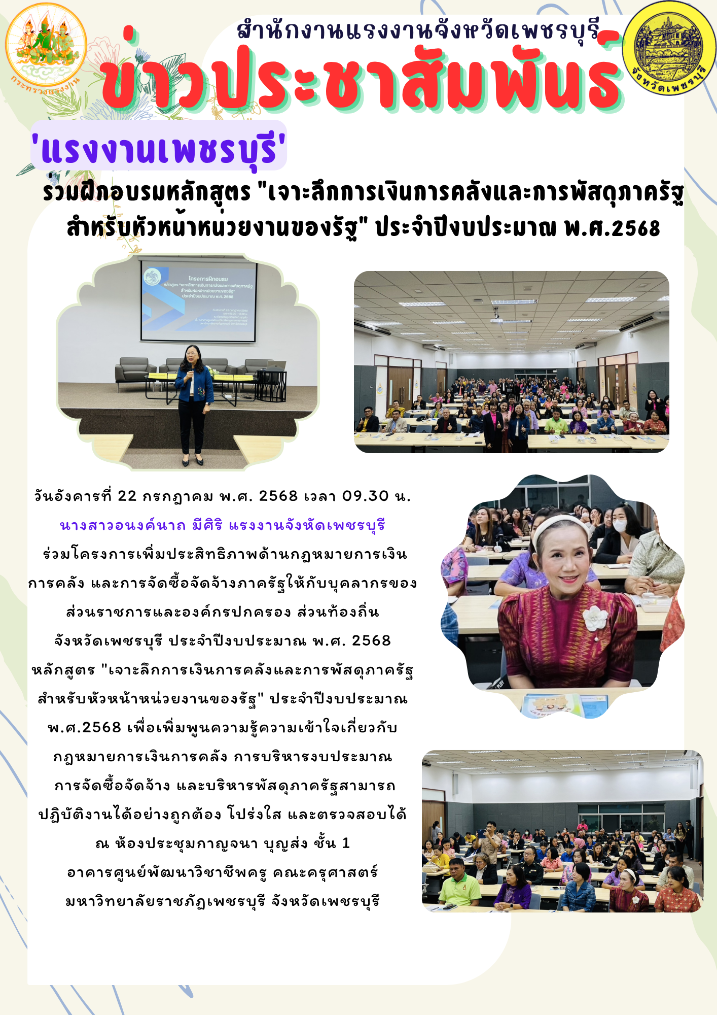 วันอังคารที่ 22 กรกฎาคม พ.ศ. 2568 เวลา 09.30 น. นางสาวอนงค์นาถ มีศิริ แรงงานจังหัดเพชรบุรี ร่วมโครงการเพิ่มประสิทธิภาพด้านกฎหมายการเงินการคลัง และการจัดซื้อจัดจ้างภาครัฐให้กับบุคลากรของส่วนราชการและองค์กรปกครอง ส่วนท้องถิ่น จังหวัดเพชรบุรี ประจำปีงบประมาณ พ.ศ. 2568 หลักสูตร “เจาะลึกการเงินการคลังและการพัสดุภาครัฐ สำหรับหัวหน้าหน่วยงานของรัฐ” ประจำปีงบประมาณ พ.ศ.2568 เพื่อเพิ่มพูนความรู้ความเข้าใจเกี่ยวกับกฎหมายการเงินการคลัง การบริหารงบประมาณการจัดซื้อจัดจ้าง และบริหารพัสดุภาครัฐสามารถปฏิบัติงานได้อย่างถูกต้อง โปร่งใส และตรวจสอบได้ ณ ห้องประชุมกาญจนา บุญส่ง ชั้น 1 อาคารศูนย์พัฒนาวิชาชีพครู คณะครุศาสตร์ มหาวิทยาลัยราชภัฏเพชรบุรี จังหวัดเพชรบุรี